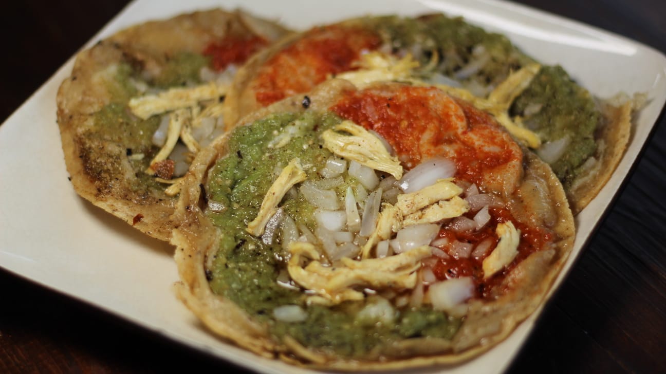 Totopos doraditos bañados en salsa verde, roja o habanero cremosa, con quesito, cebolla morada y lechuga.