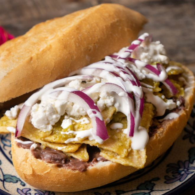 Milanesa crujiente, jitomate, cebolla, frijoles, aguacate y queso.