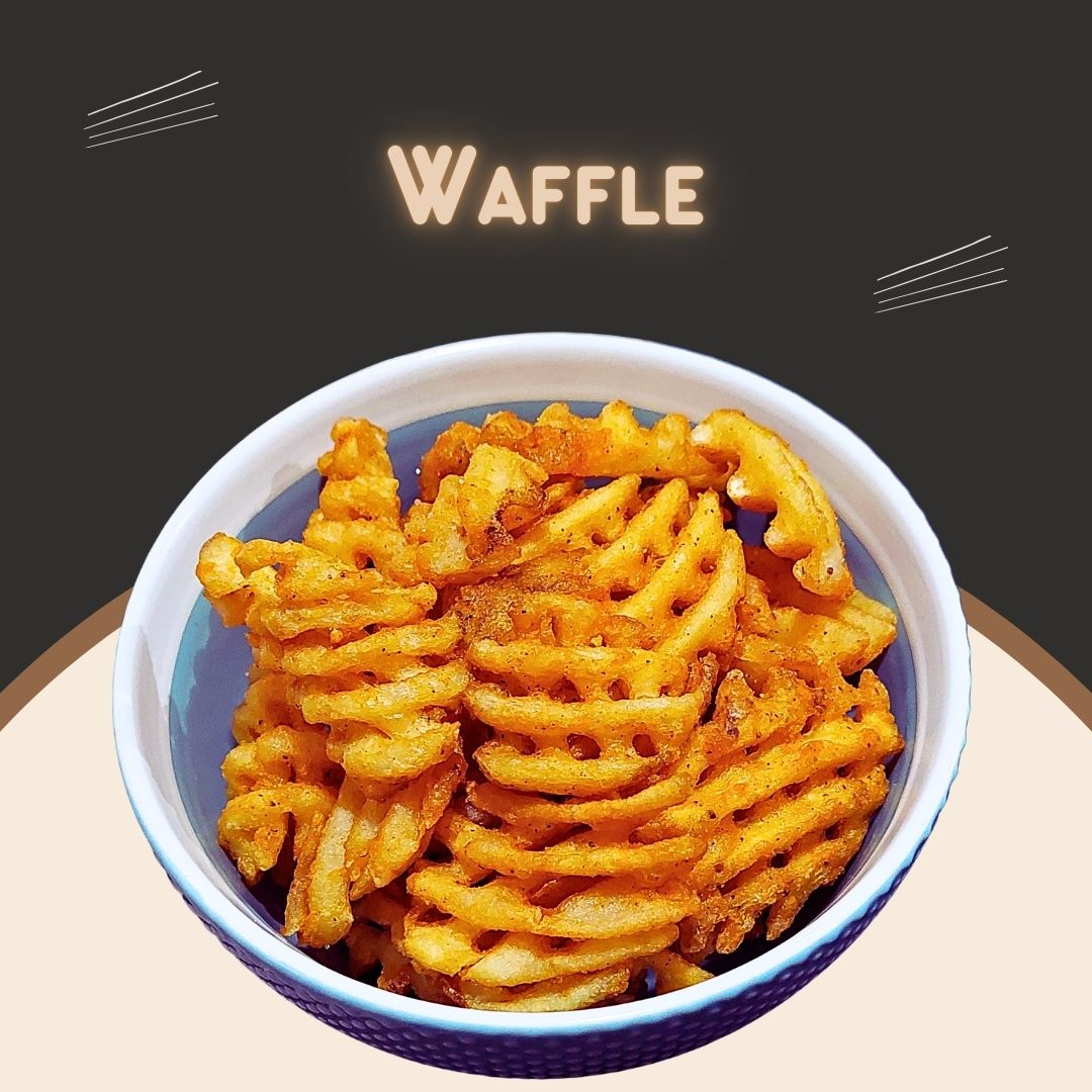250 gr (peso en crudo) de papa sazonada corte waffle. Acompañadas de catsup, valentina, mostaza y mayonesa.