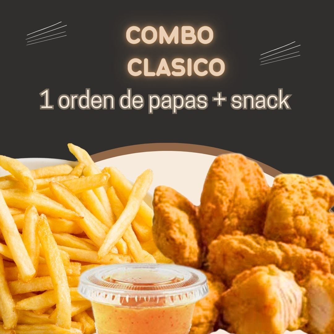 1 orden de papas + 1 snack + 1 aderezo