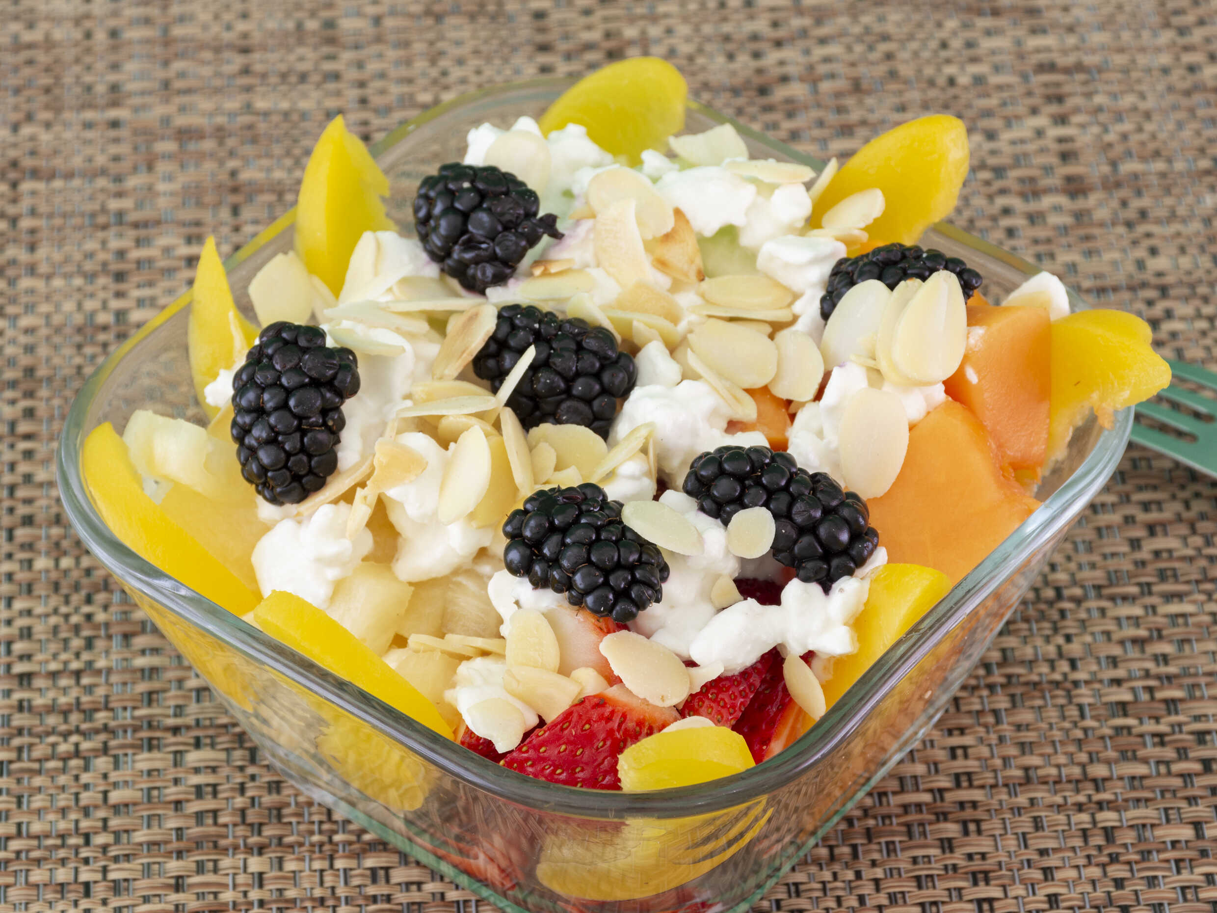 Papaya, melón, zarzamora, durazno, piña, fresa y almendra fileteada.