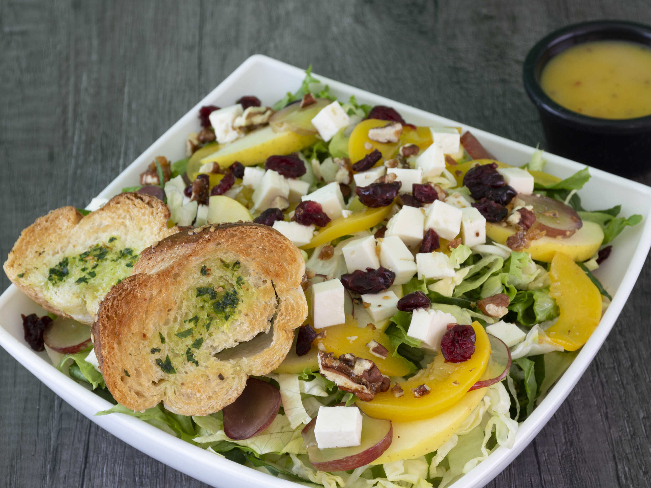 Lechuga, espinaca, uva, arándano, manzana, durazno, queso y nuez.