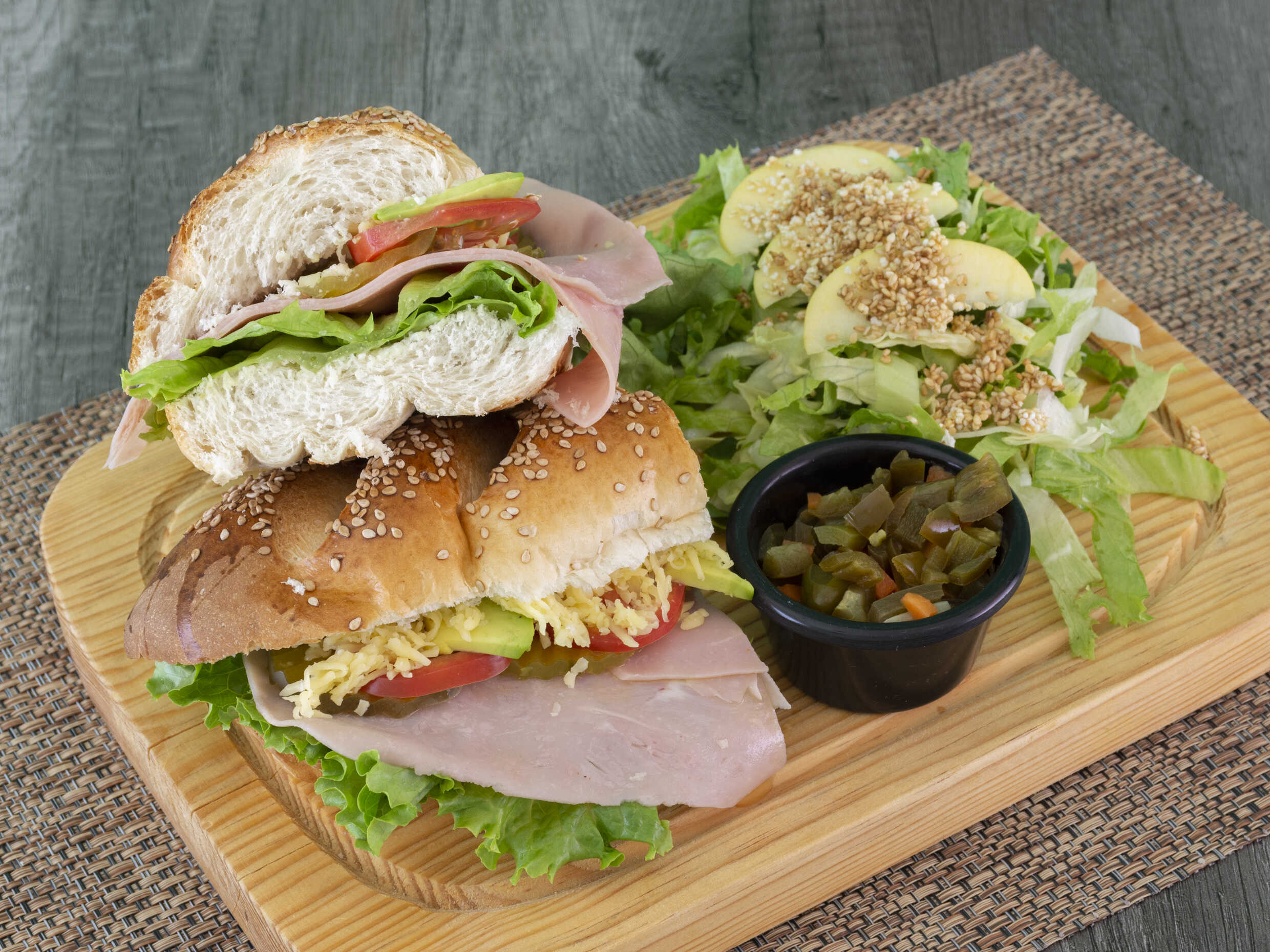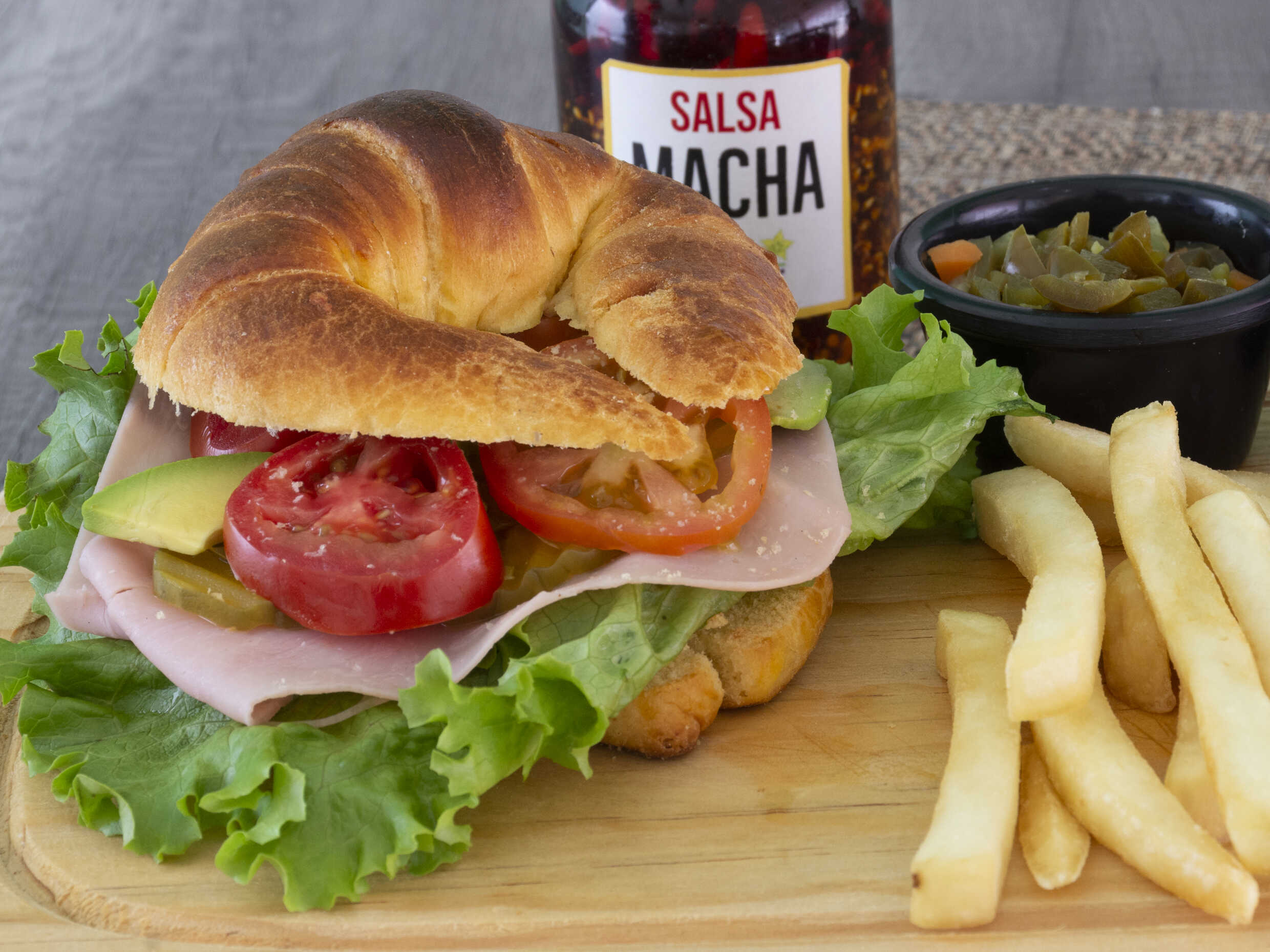Mayonesa, jamón, lechuga, jitomate, pepinillos, queso manchego y aguacate.
