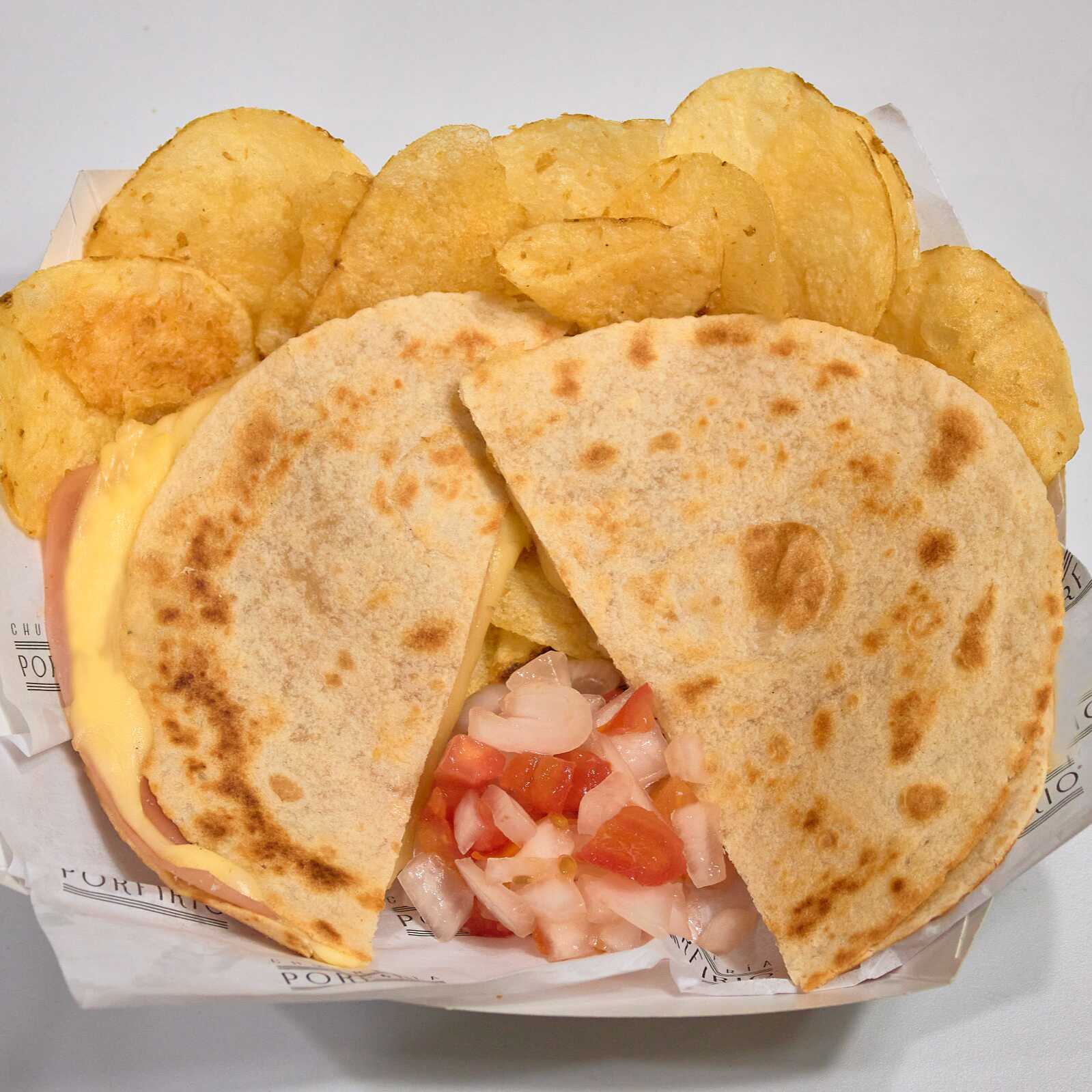 Sándwich con tortilla de harina, jamón y queso manchego, acompañadas con pico de gallo.