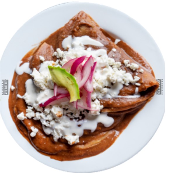 Tres tortillas pochadas en aceite, bañadas con salsa verde o roja, servidas con crema, queso fresco y cebolla.