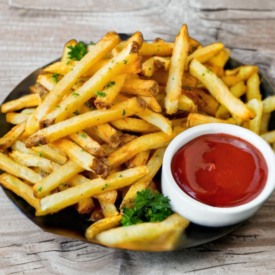 Papas a la francesa (120 g peso frito), acompañadas de salsa de tomate o capzu .