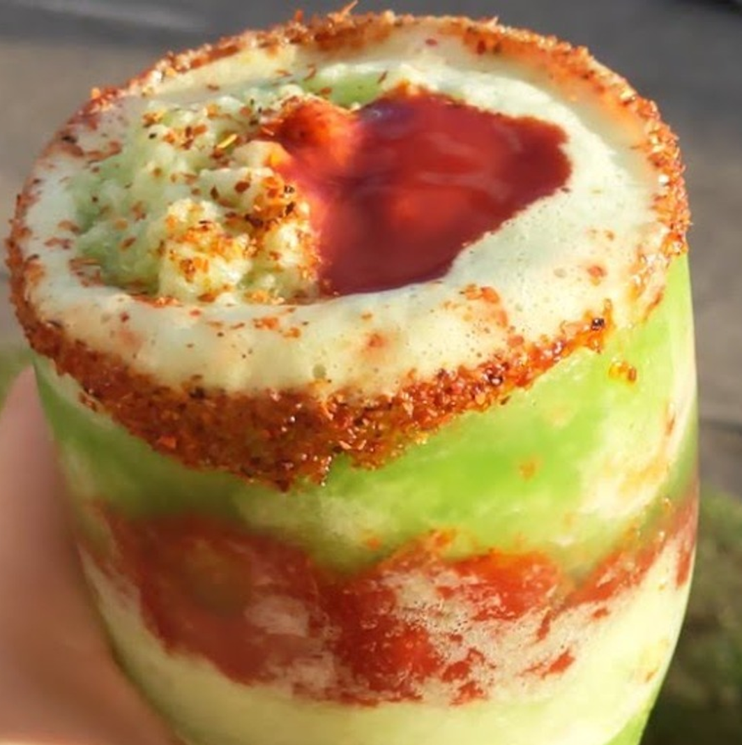 Bebida a base de hielo y helado de limón / Chamoy Pelón Pelo Rico® / Tajín® en polvo / Bola de Helado