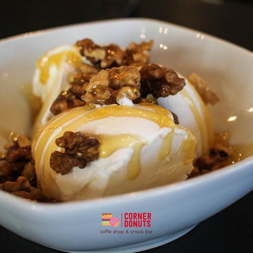 3 bolas de helado de vainilla / Caramelo líquido/ Nuez picada