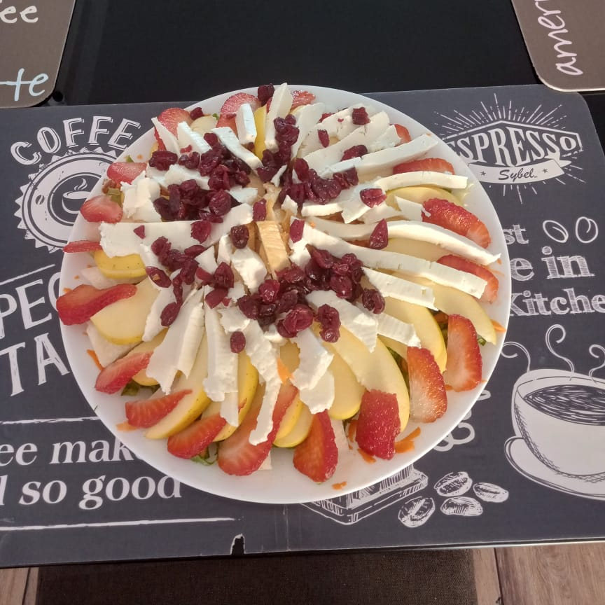 lechuga, manzana, fresa, queso panela, jicama, arandanos y pechuga de pollo