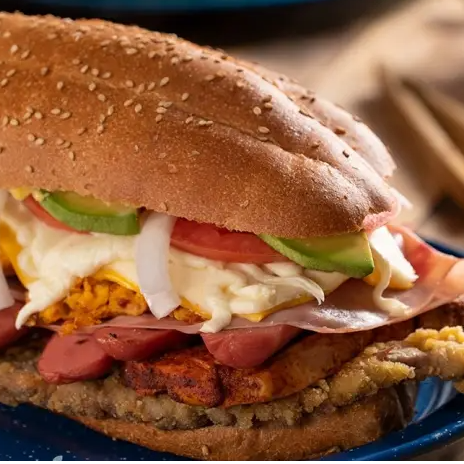 Tortas de 23 cm aprox. Preparadas con milanesa de pollo, jamón, salchicha, queso amarillo, lechuga, quesillo, jitomate, cebolla, aguacate, mayonesa, rajas o chipotle