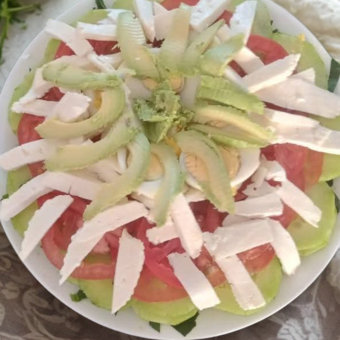 Lechuga, jitomate, pepino, aguacate, aderezo de mostaza con miel y pechuga de pollo