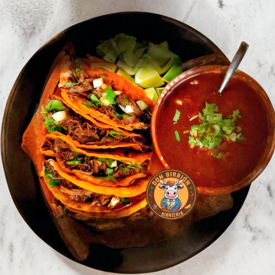 Una porción de birria (consomé y carne) equivalente a un plato, ideal para un comensal, incluye 3 tortillas de maíz, salsa, cilantro, cebolla y limones.