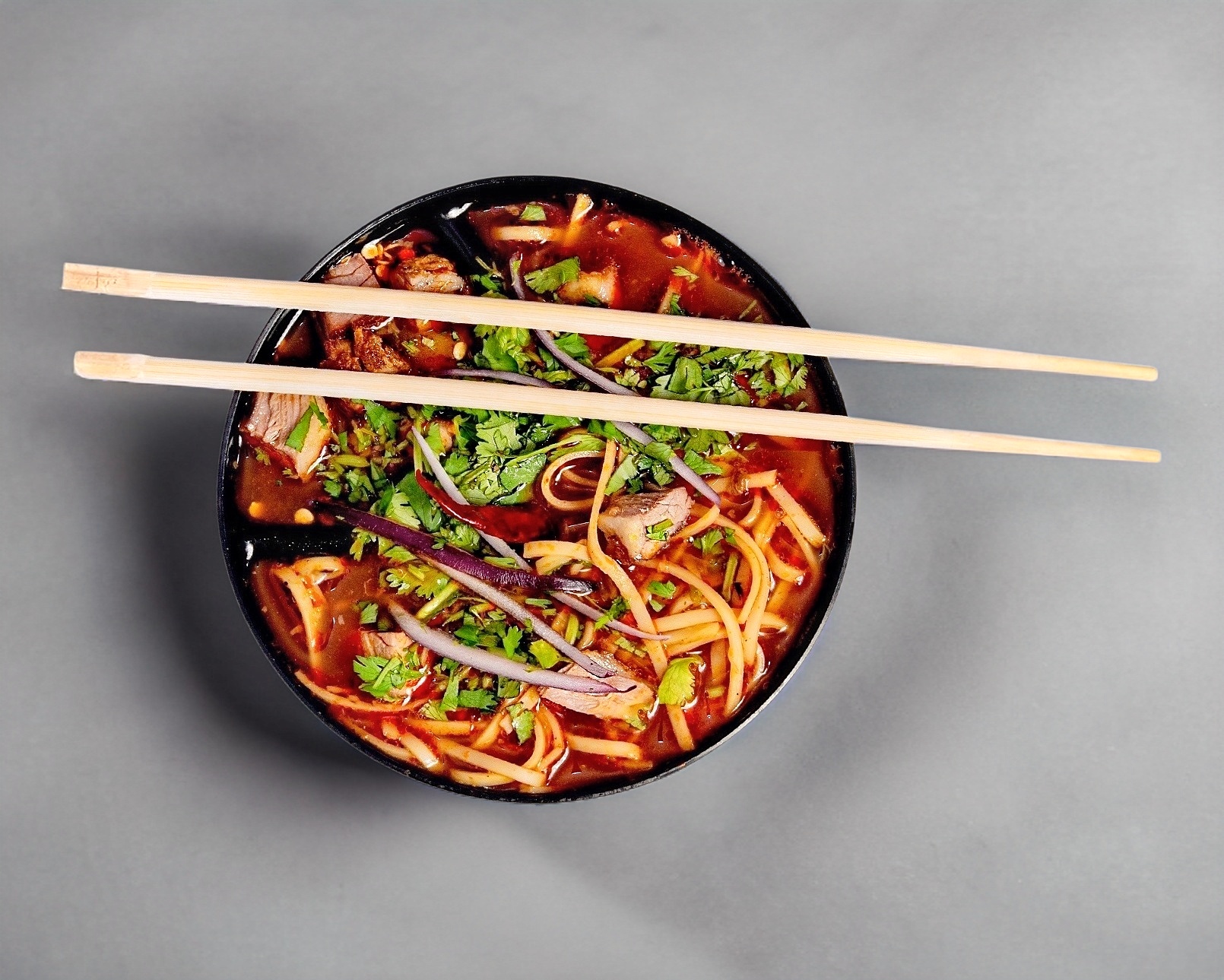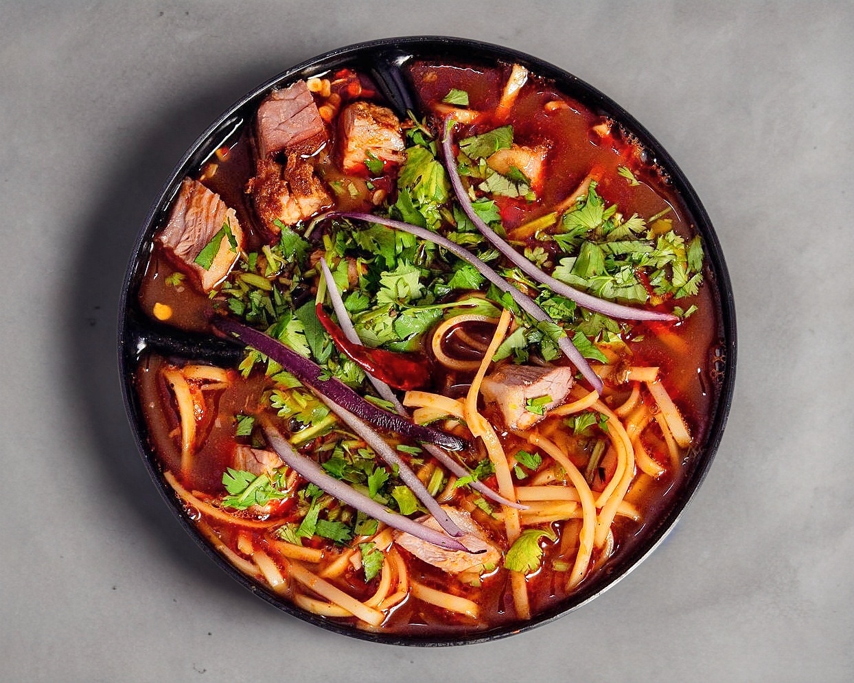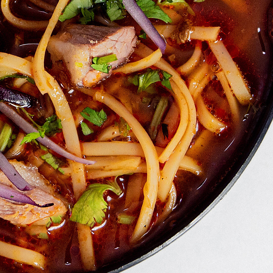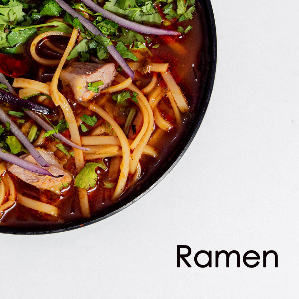 Mezcla perfecta entre birria y ramen, acompañado de cilantro y cebolla.