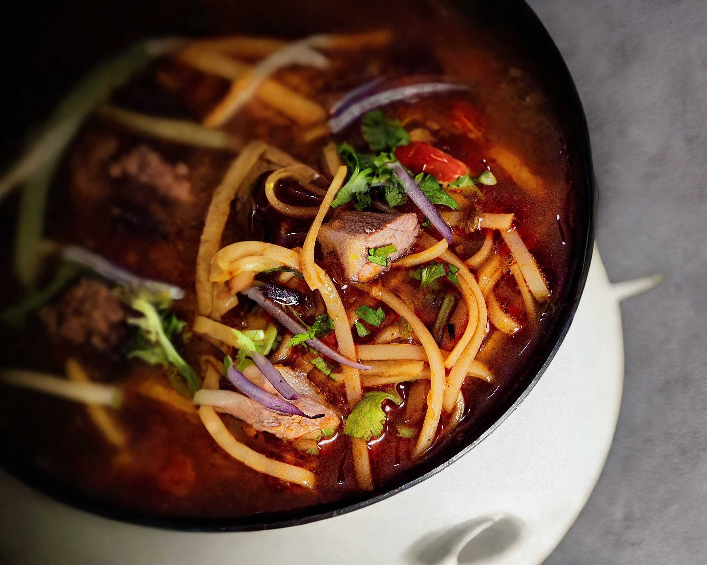 Mezcla de birria con ramen. Acompañado de cebolla, cilantro y limón.