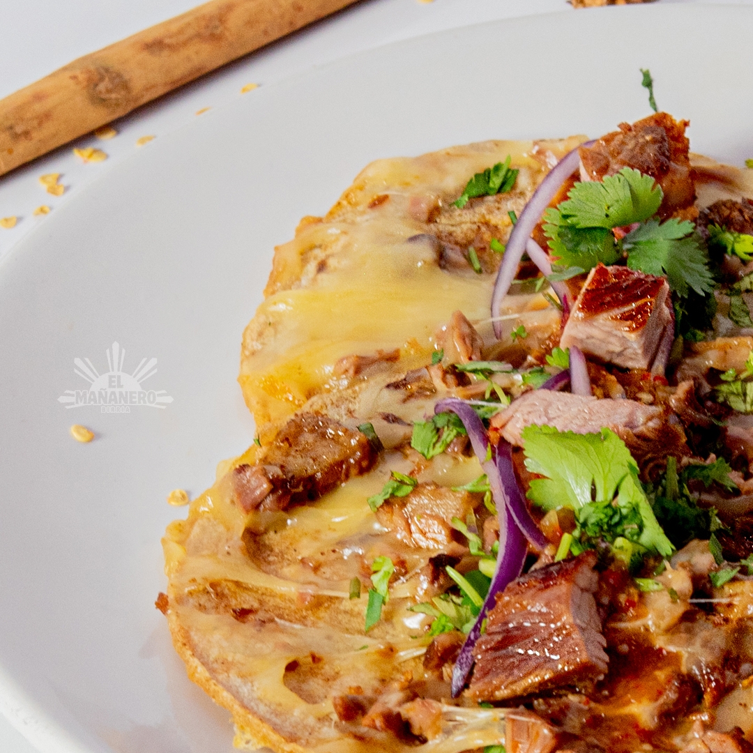 Acompañado de cebolla, crema, queso y frijoles refritos.