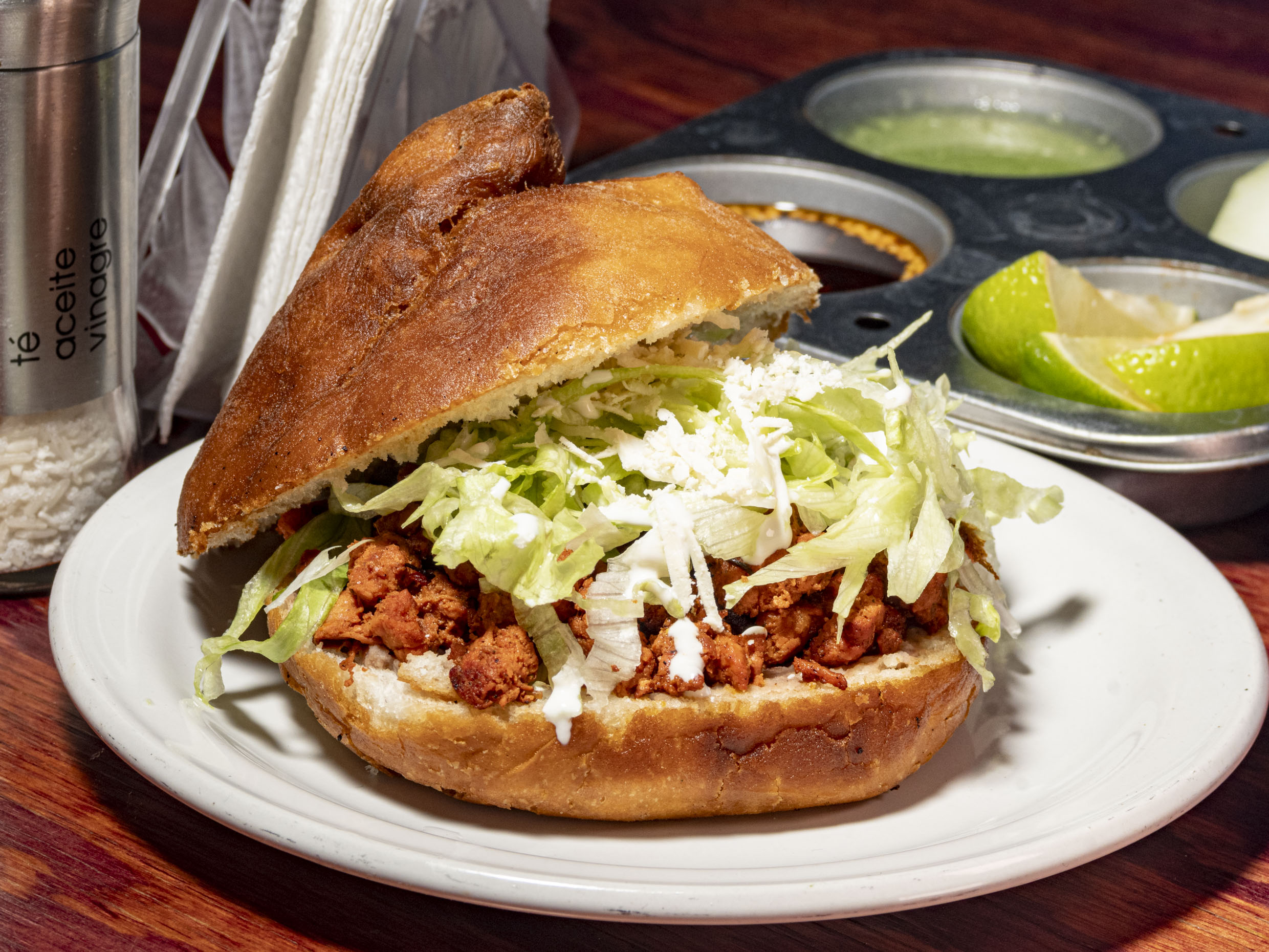 Pambazo relleno de frijoles, carne a elegir, lechuga, queso, crema y acompañado de salsa