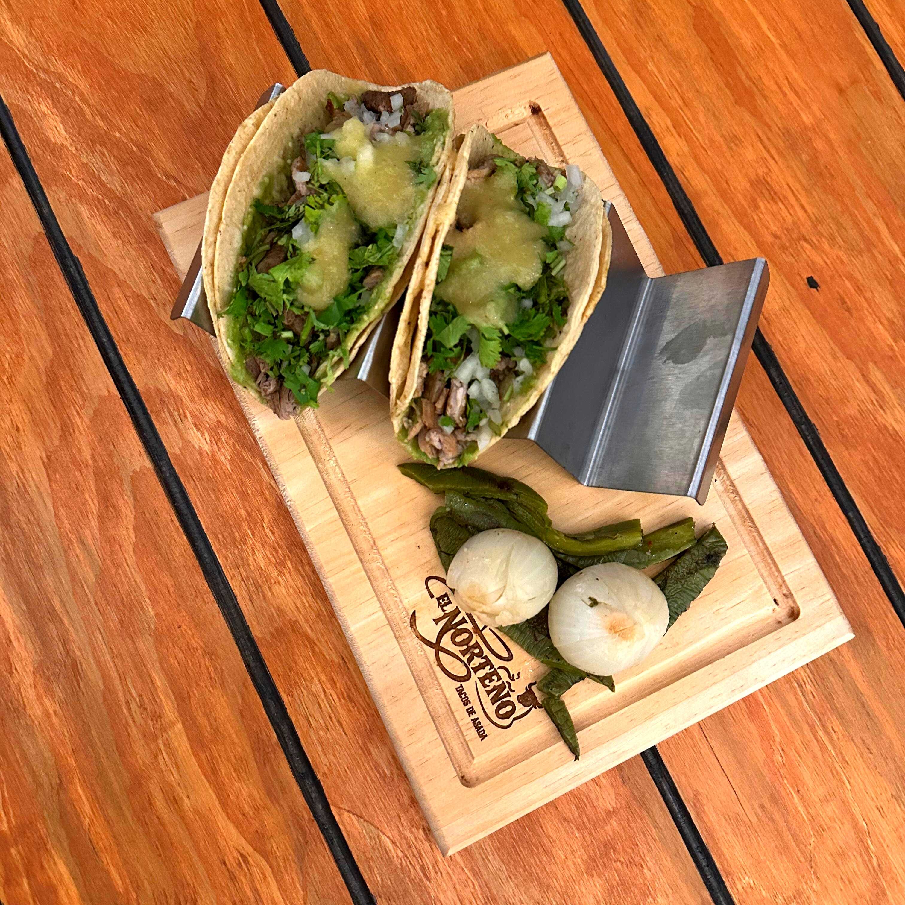 2 Tortillas de maiz acompañado de una cama de aguacate y carne asada, cebollas cambray y nopales algusto