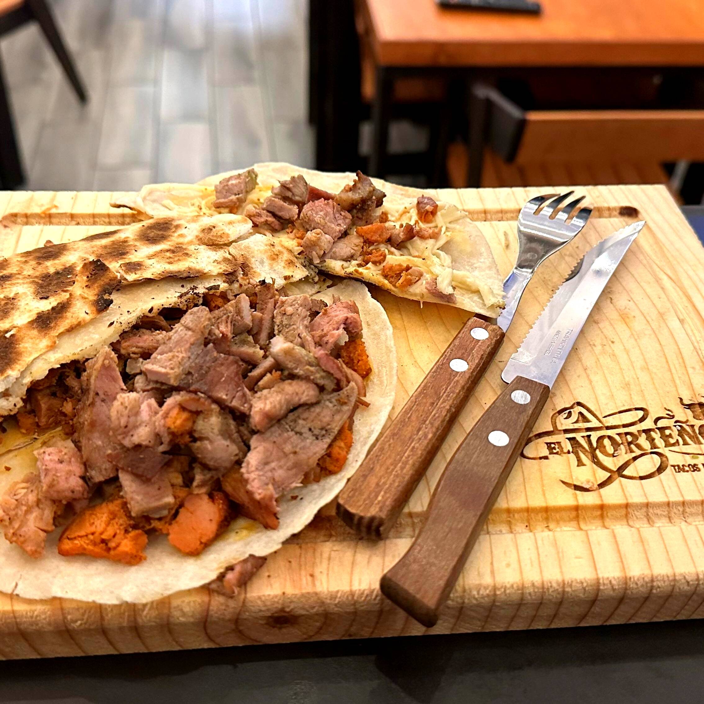 2 tortillas de harina, carne azada y longaniza acompañada de una cama de queso