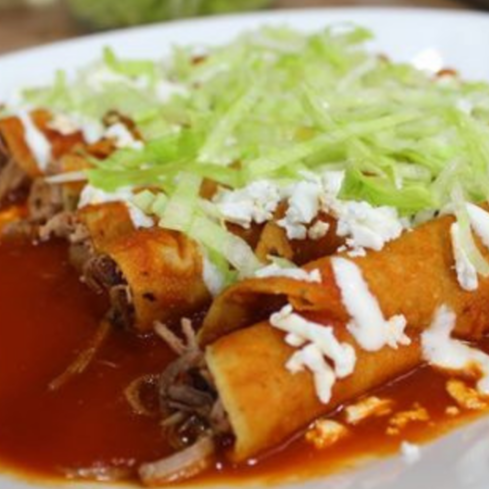 De la casa tacos dorados 3pz (queso, crema, aguacate, lechuga, salsa pueden ser de queso, pollo, salchicha)