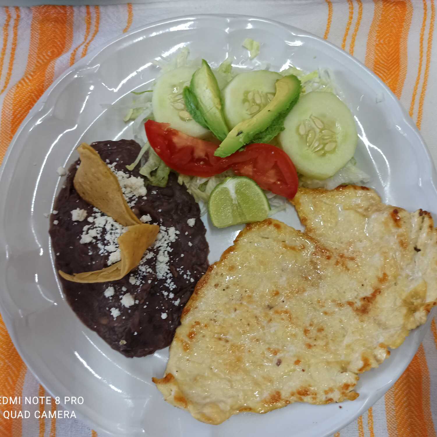 Tortilla de harina, rellena de jamon, quesillo y queso amarillo acompañado de frijoles refritos
