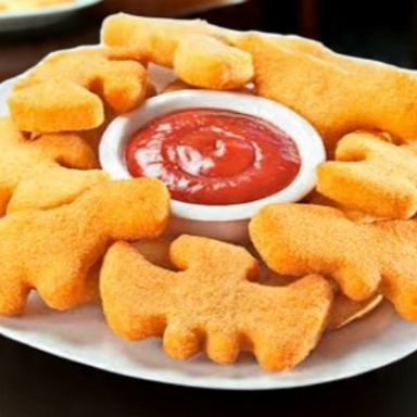 220 g de nugget con forma de dinosaurio frito con aderezos (queso líquido, catsup y Valentina o botanera)