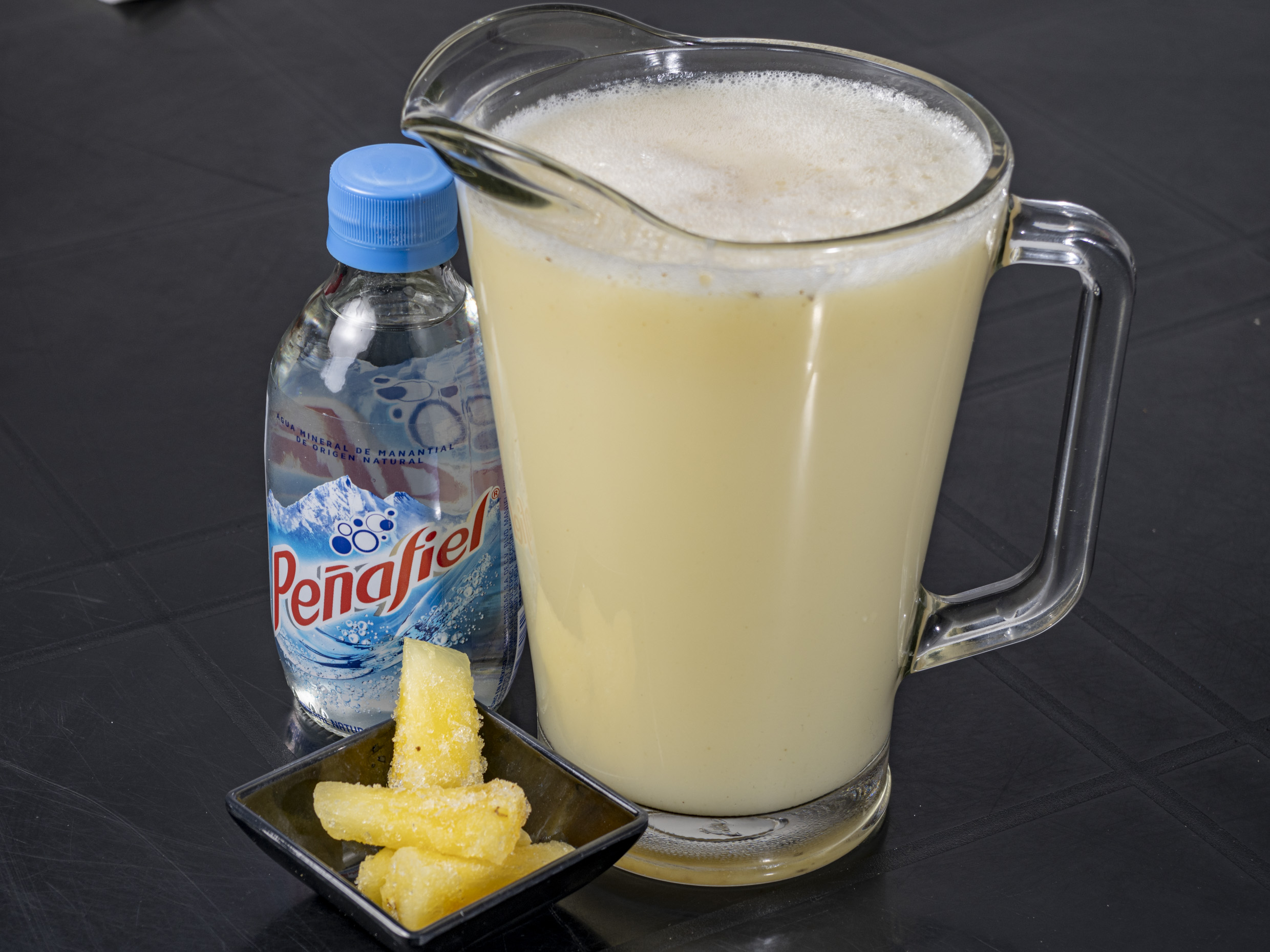 Refrescante bebida elaborada con zumo de frutas y toppings de nata de coco.