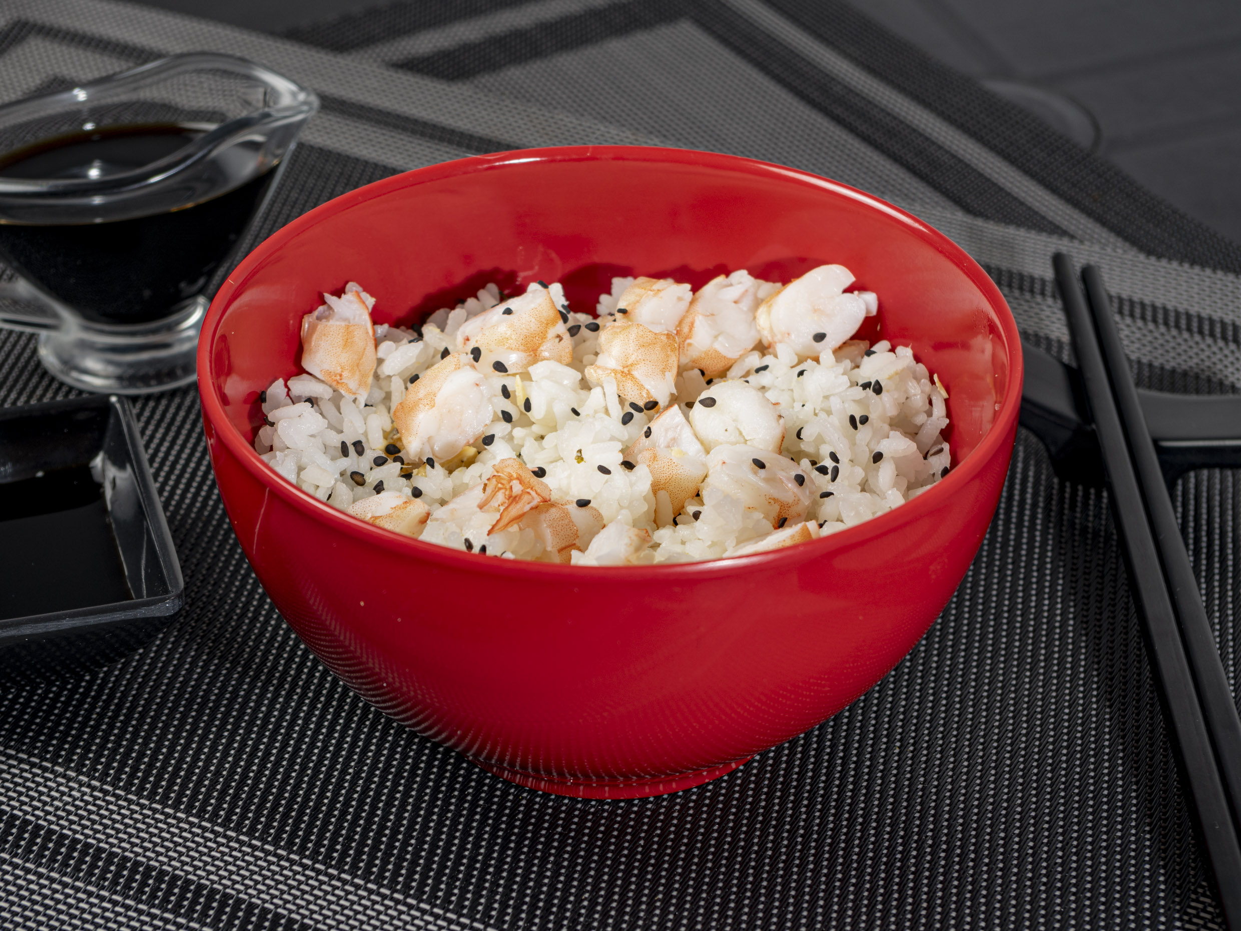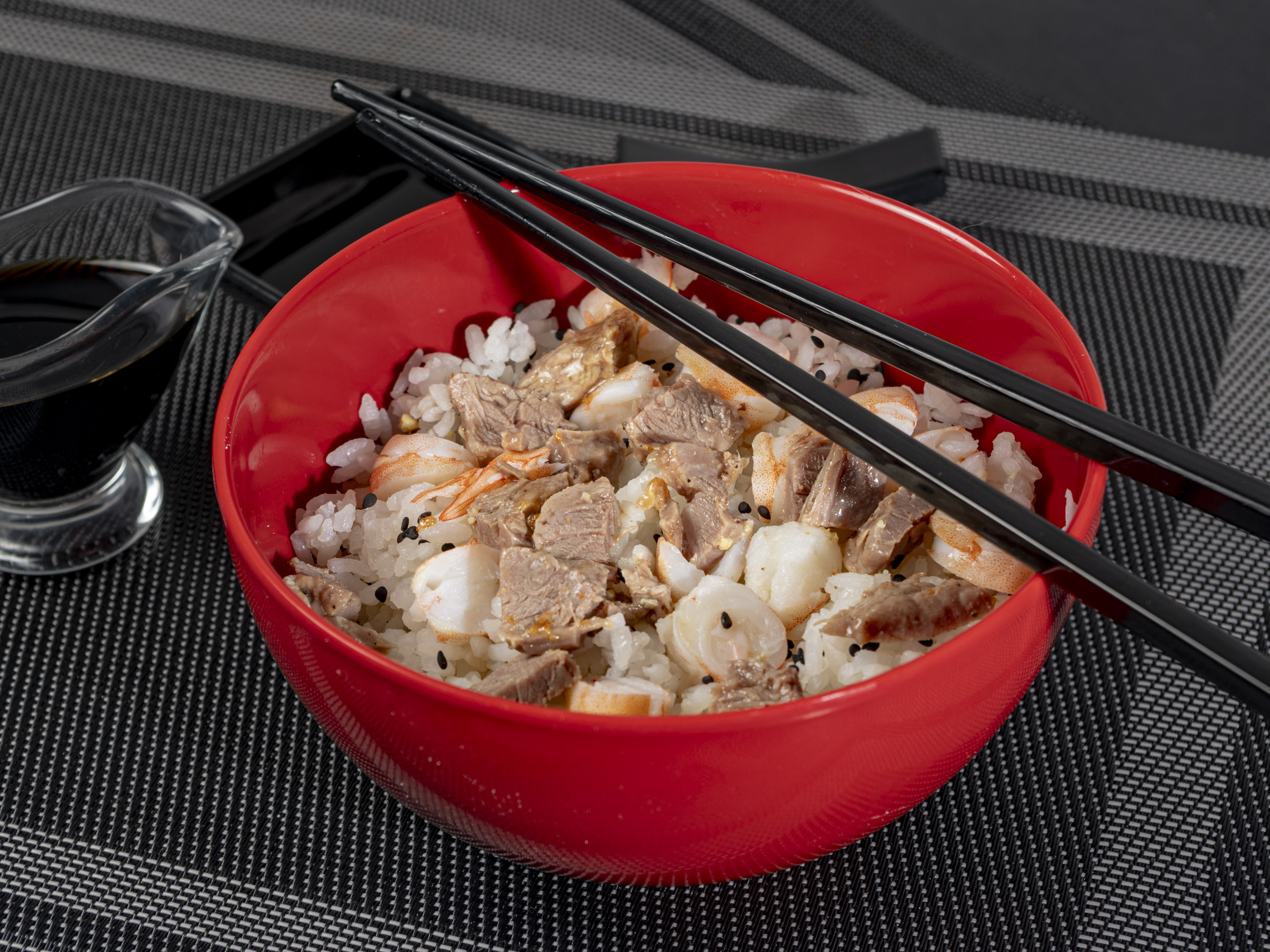 Arroz blanco al vapor con tu proteína favorita: pollo, cerdo, camarón, pulpo o arrachera.