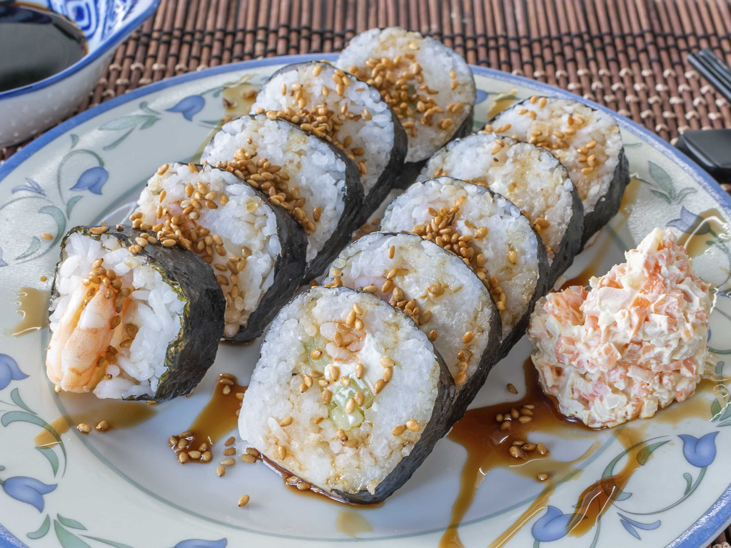 Rollos de alga, rellenos de arroz al vapor, pepino, aguacate y zanahoria; bañados en salsa de anguila.