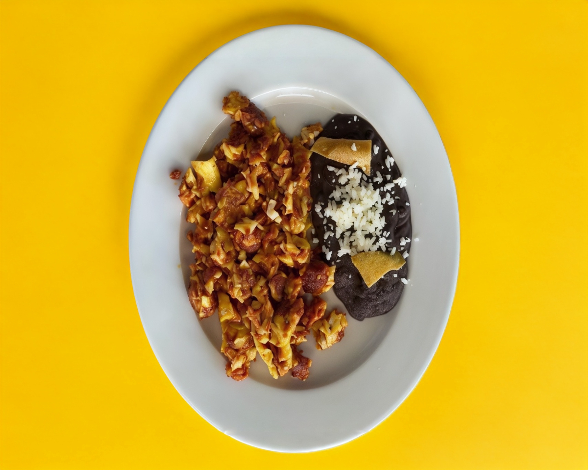 Spaguetti rojo con queso y jamon sazonado en un sofrito de jitomate con el sazon de casa, chuleta acompañada de pure de papa y frijoles refritos. Agua de sabor medio litro y 4 tortillas.