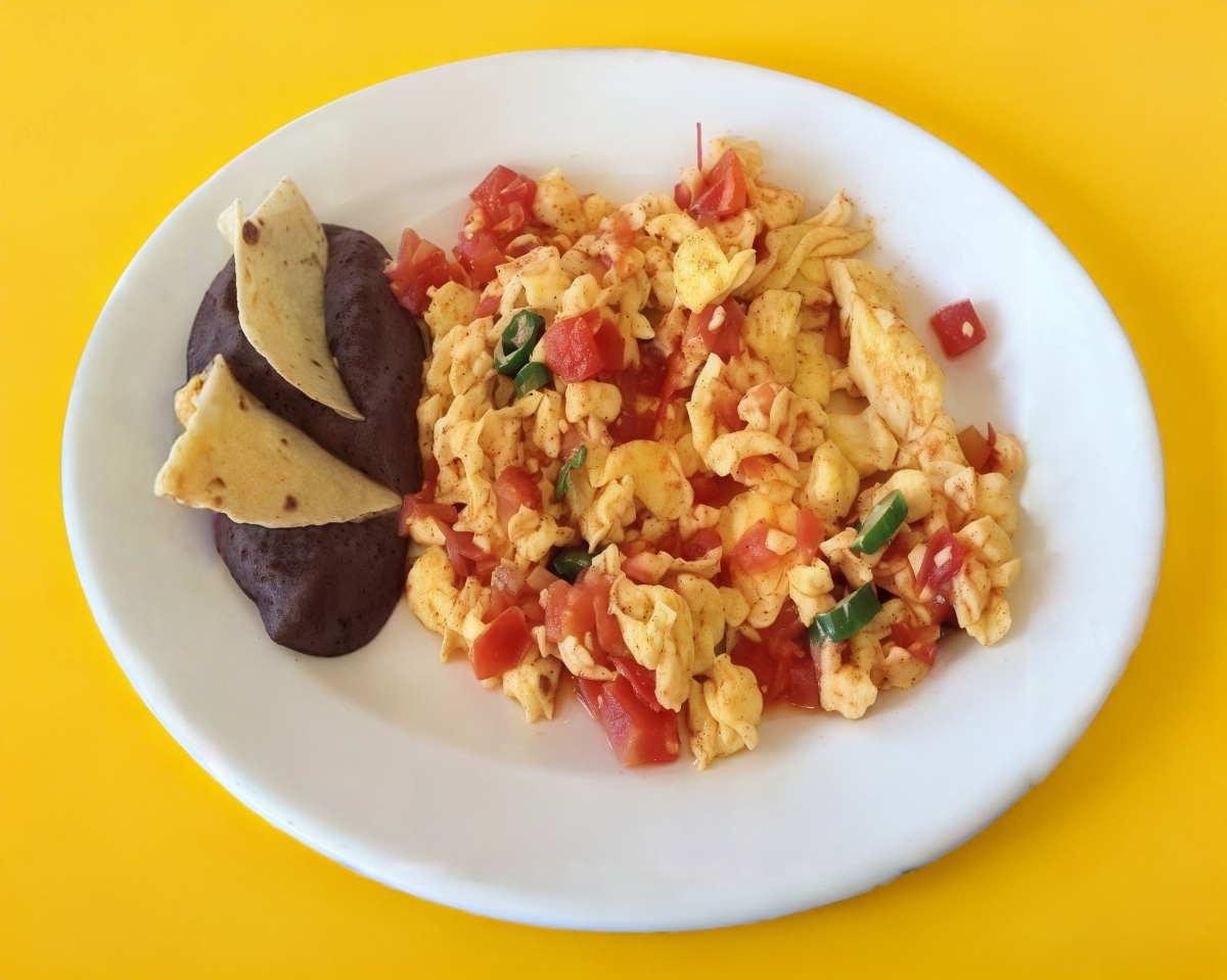 Incluye café y jugo verde o jugo de naranja, Fruta, Pan, Exquisitos huevos revueltos con jamón, cebolla, chile jalapeño toreado, frijoles refritos, guarnición de arroz y 4 tortillas