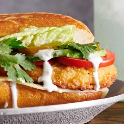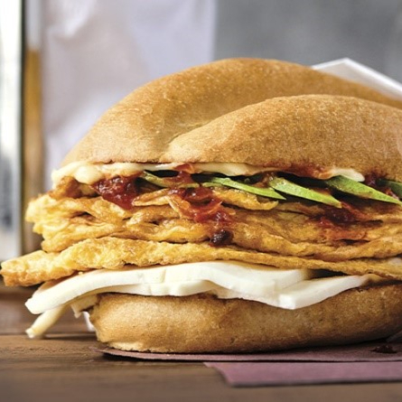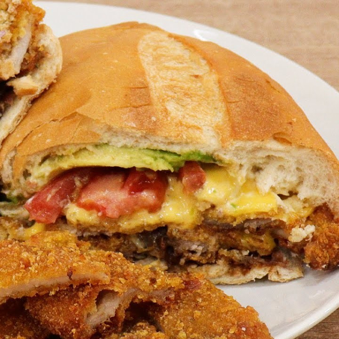 Torta de milanesa de Pollo, el pan lleva una base de frijol, mayonesa, papas a la francesa y rajas.
