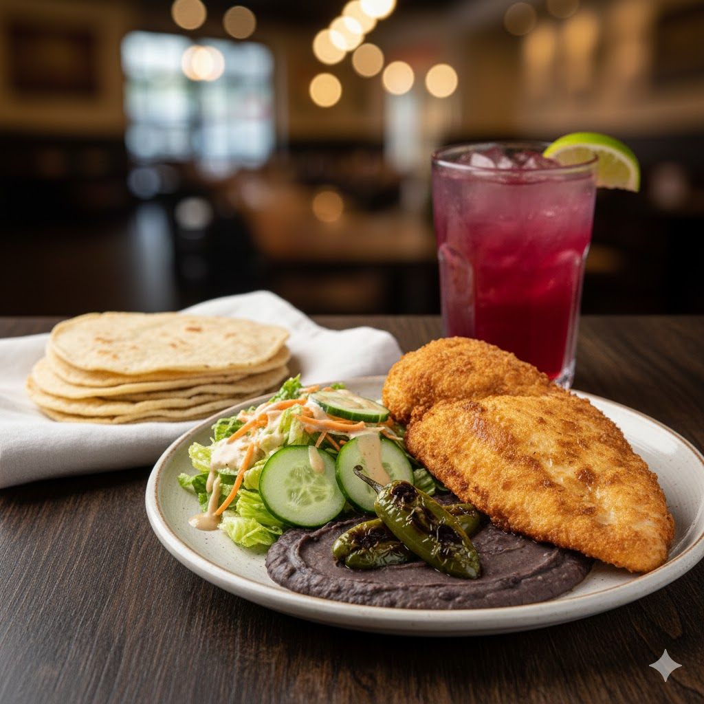 Arroz rojo, Deliciosa pechuga empanizada acompañada con ensalada fresca (pepino lechuga zanahoria y aderezo de casa), frijoles refritos y chile toreado, 4 tortillas, y agua de sabor medio litro.