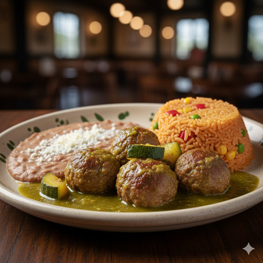 Sopa fria con jamón y queso, albóndigas en salsa verde con calabazas acompañadas de frijoles refritos, 4 tortillas, agua de sabor medio litro.
