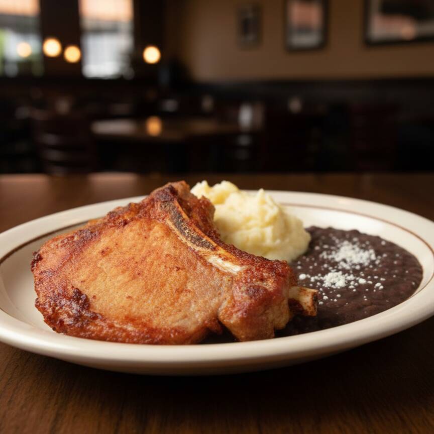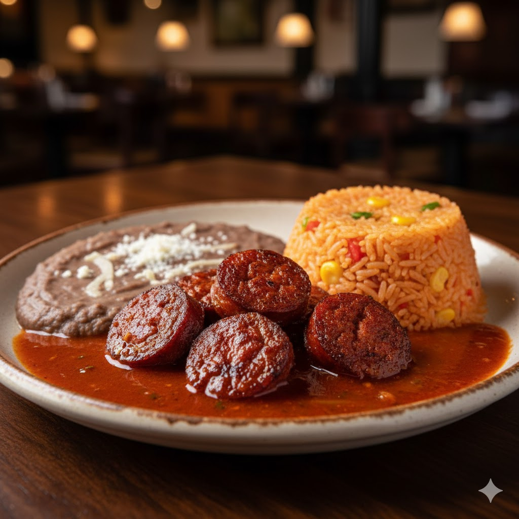 Exquisita Chistorra de cerdo azada, con papas hervidas sazonadas con mantequilla y cebolla sofrita gratinadas con queso manchego lleva guarnición de arroz y de frijoles refritos chile toreado, limón y 4 piezas de tortillas