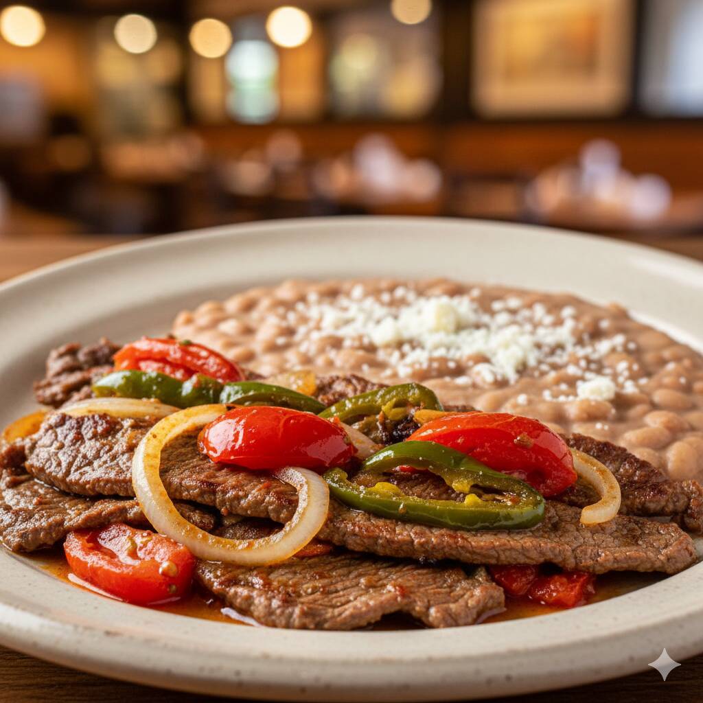 Exquisito corte de res azado con papas hervidas sazonadas con mantequilla y cebolla sofrita gratinadas con queso manchego lleva guarnición de arroz y de frijoles refritos chile toreado, limón y lleva 4 piezas de tortillas
