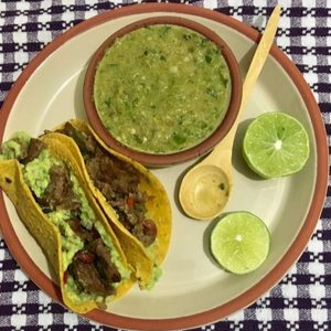 Taco de guisado de bistec de puerco en salsa verde, Lleva dos tortillas, frijoles, arroz y chile toreado.