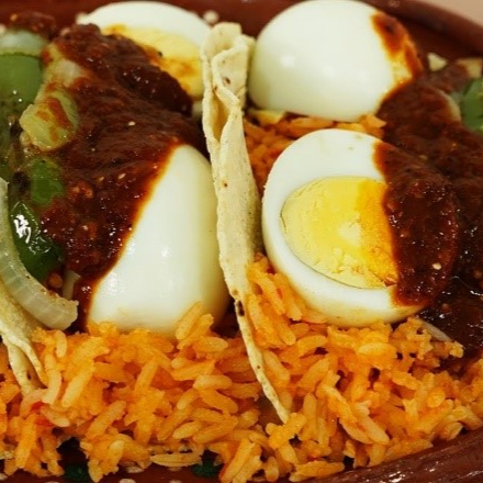 Incluye Café, Fruta, Pan, Exquisitos huevos revueltos con jamón y queso manchego, acompañados de chile toreado, frijoles refritos, guarnición de arroz y 4 tortillas.