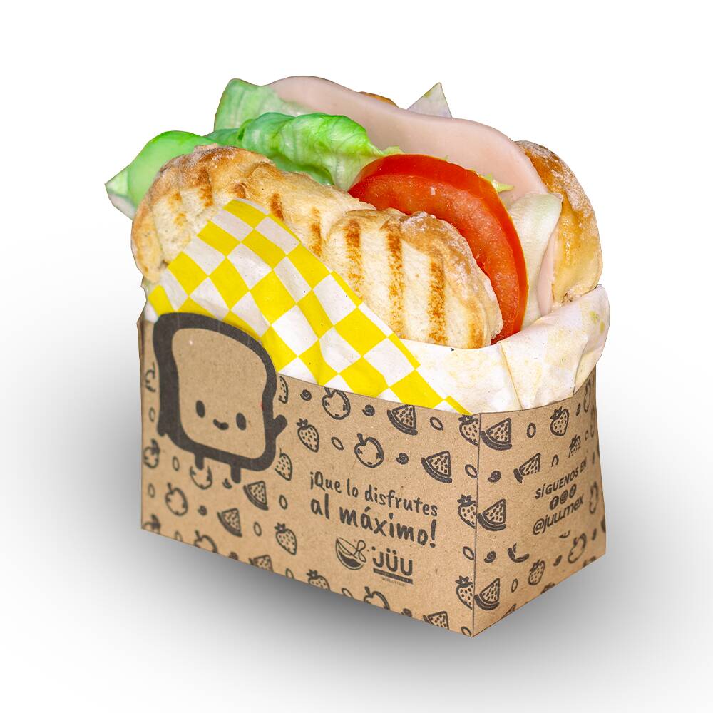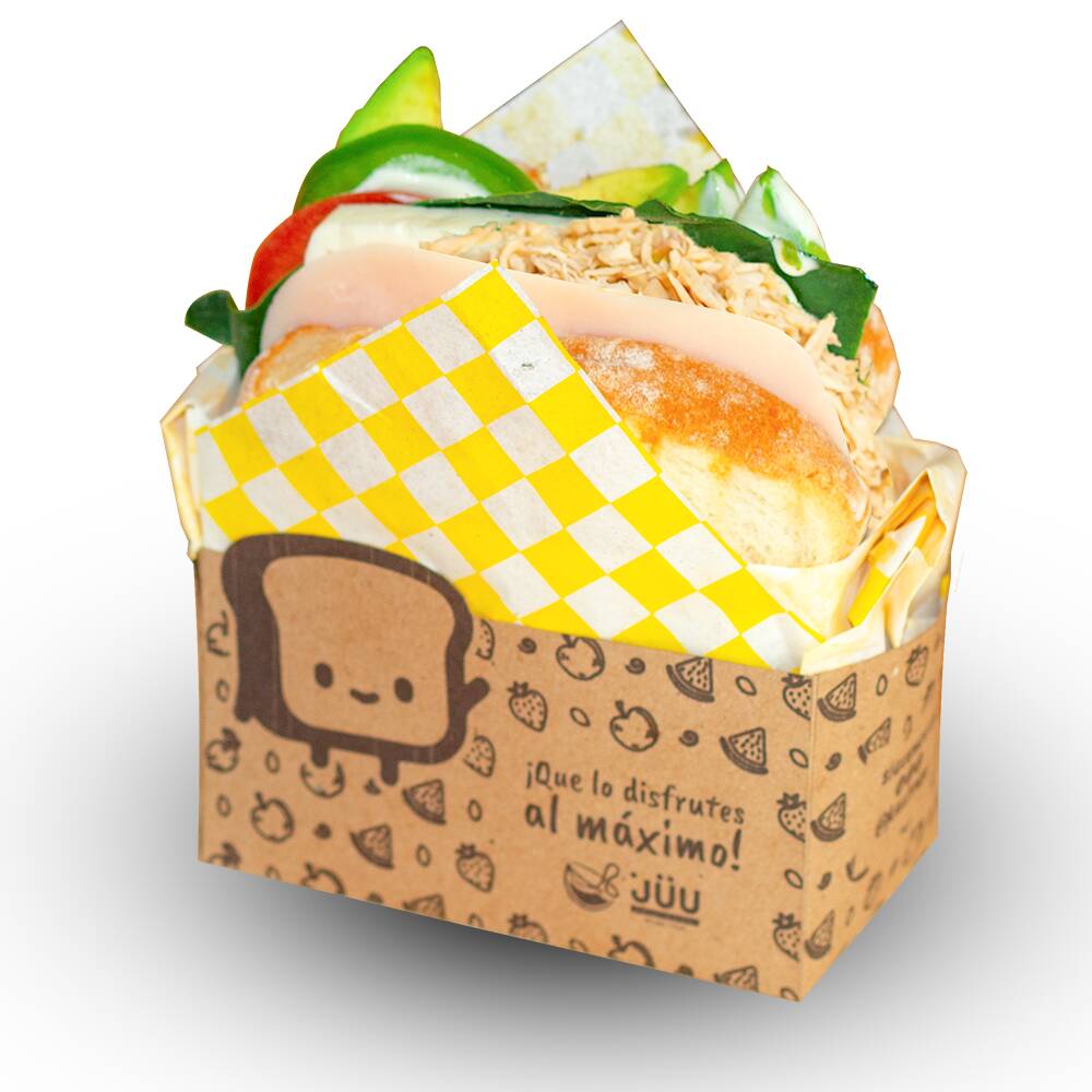 Pan, mayonesa, jamón, queso panela, espinaca, jitomate, pimiento, aguacate, pollo desmenuzado, aderezo ranch y lechuga.