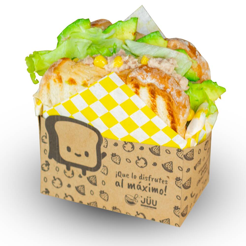 Pan, preparado de atún (atún, dientes de elote amarillos y mayonesa), lechuga, aguacate y sal.