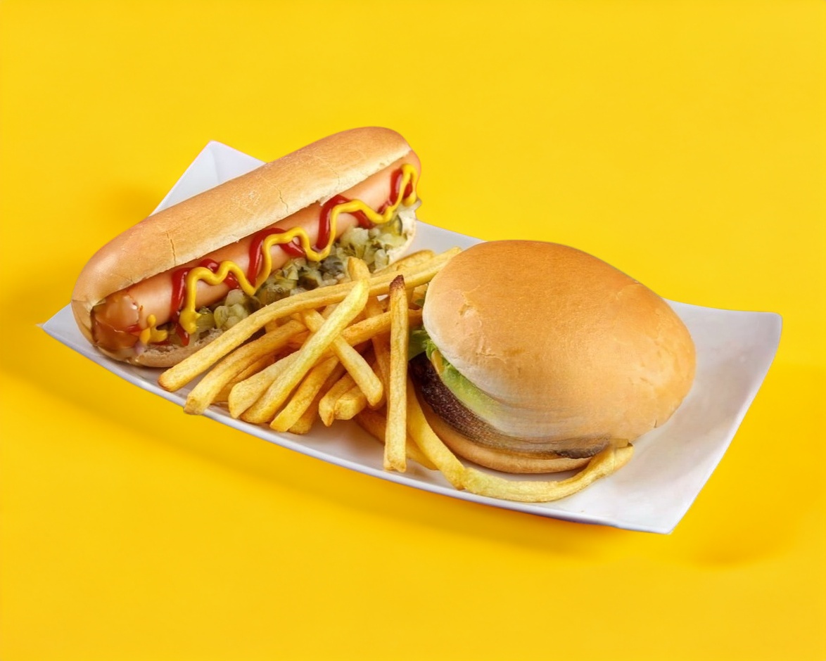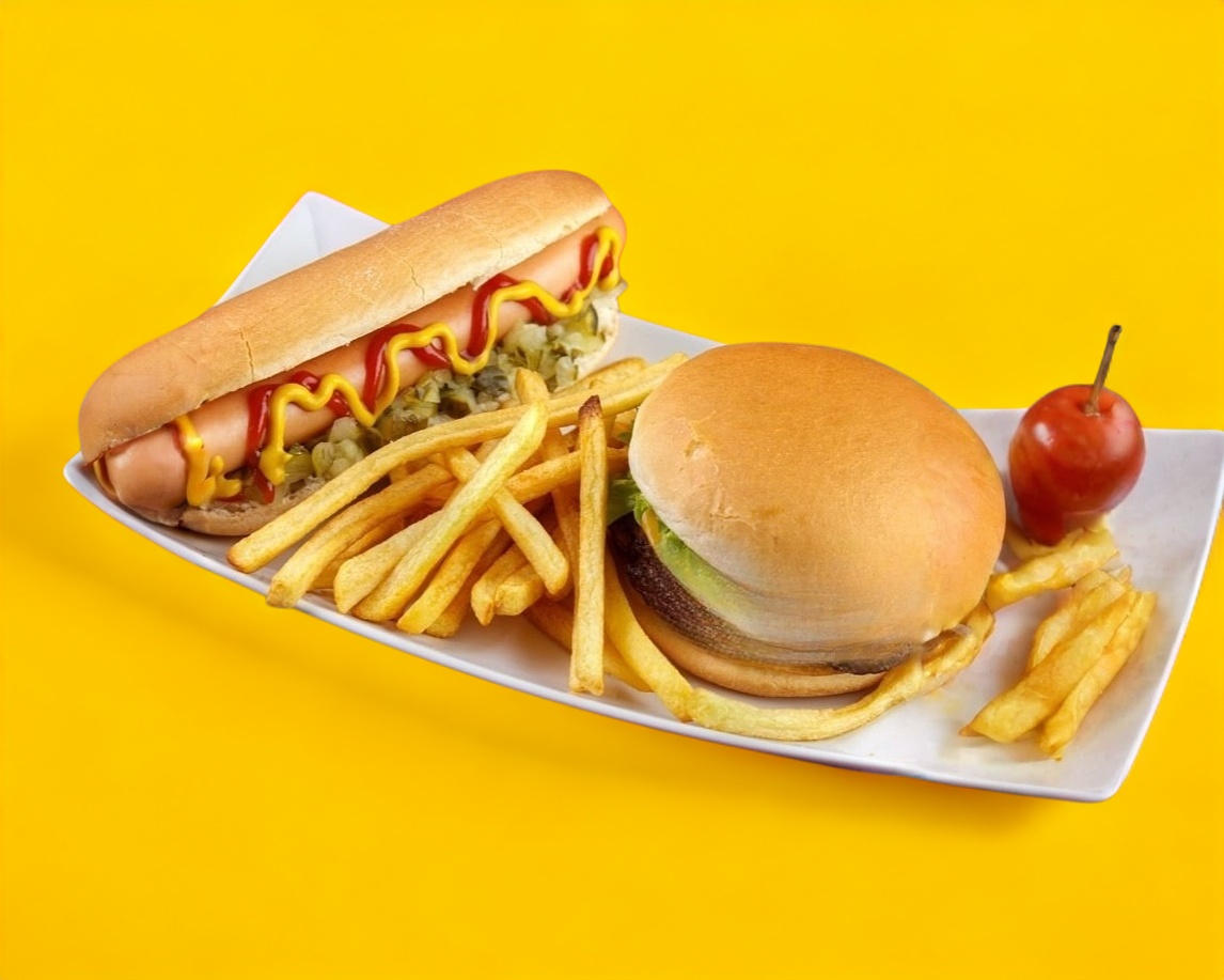 HAMBURGUESA SENCILLA + POSTRE GRATIS*1 + 1 HOT DOG SENCILLO*1 + PAPAS A LA FRANCESA 200 G*1