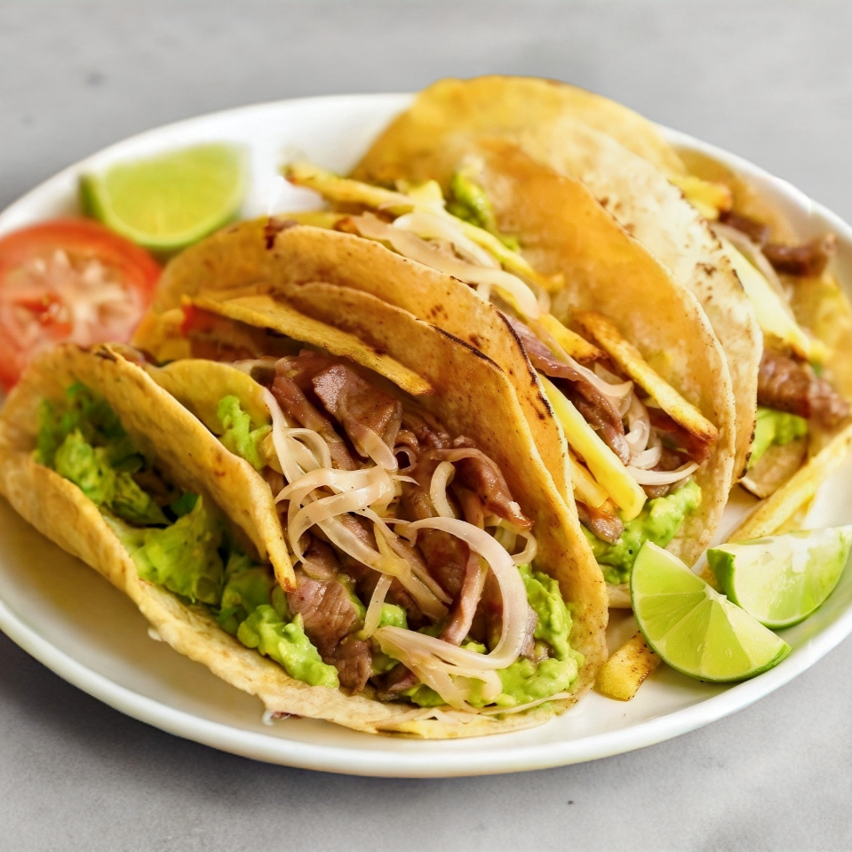 K TACO BISTEC ENCEBOLLADO CON PAPAS + POSTRE
