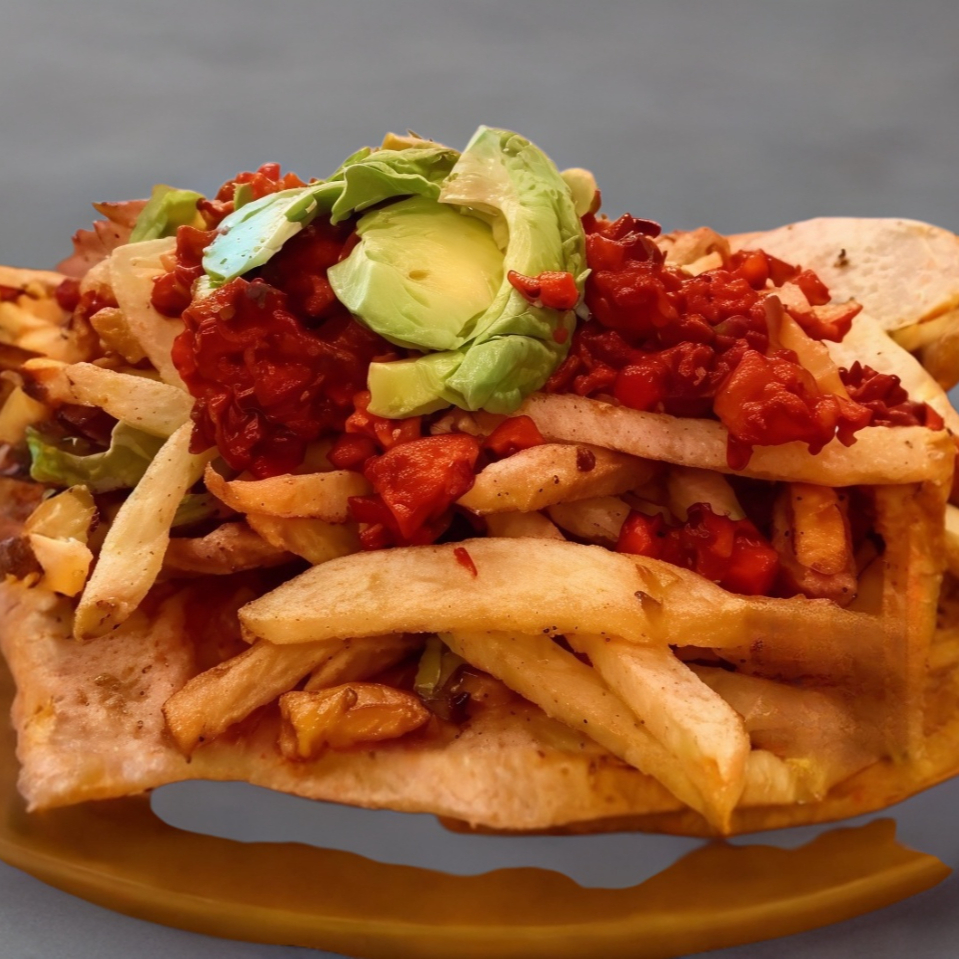 2 TORTILLAS DE COMAL, FRIJOLES REFRITOS, PAPAS FRANCESA, QUESO OAXACA, AGUACATE, SALSA