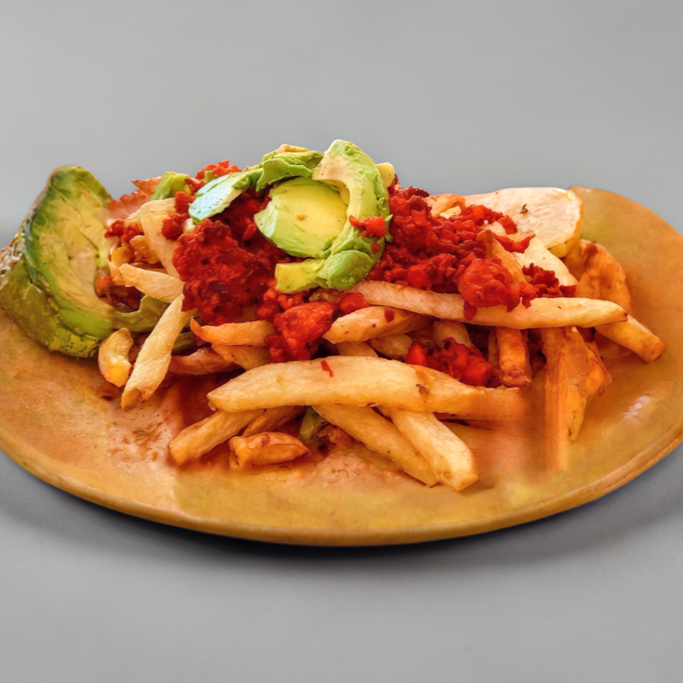 Platillo personal, 4 tortillas comaldes de maíz , 150 gramos de frijoles refritos, 250 gramos papas francesa , queso Oaxaca, aguacate en rebanadas y rajas con huevo.
