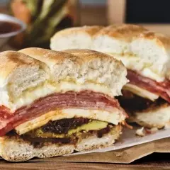 Ingredientes frijoles refritos, mayonesa, queso oaxaca gratinado, jamón de pavo, aguacate, aros de jitomate, aros de cebolla y rajas en escabeche caceras.
