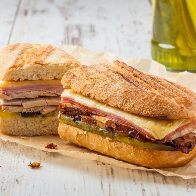 Queso Oaxaca, jamón, mayonesa, frijoles refritos, jitomate, aguacate, cebolla, rajas o chipotles en escabeche.