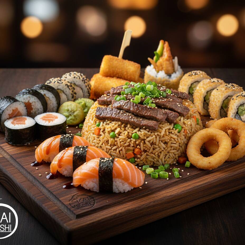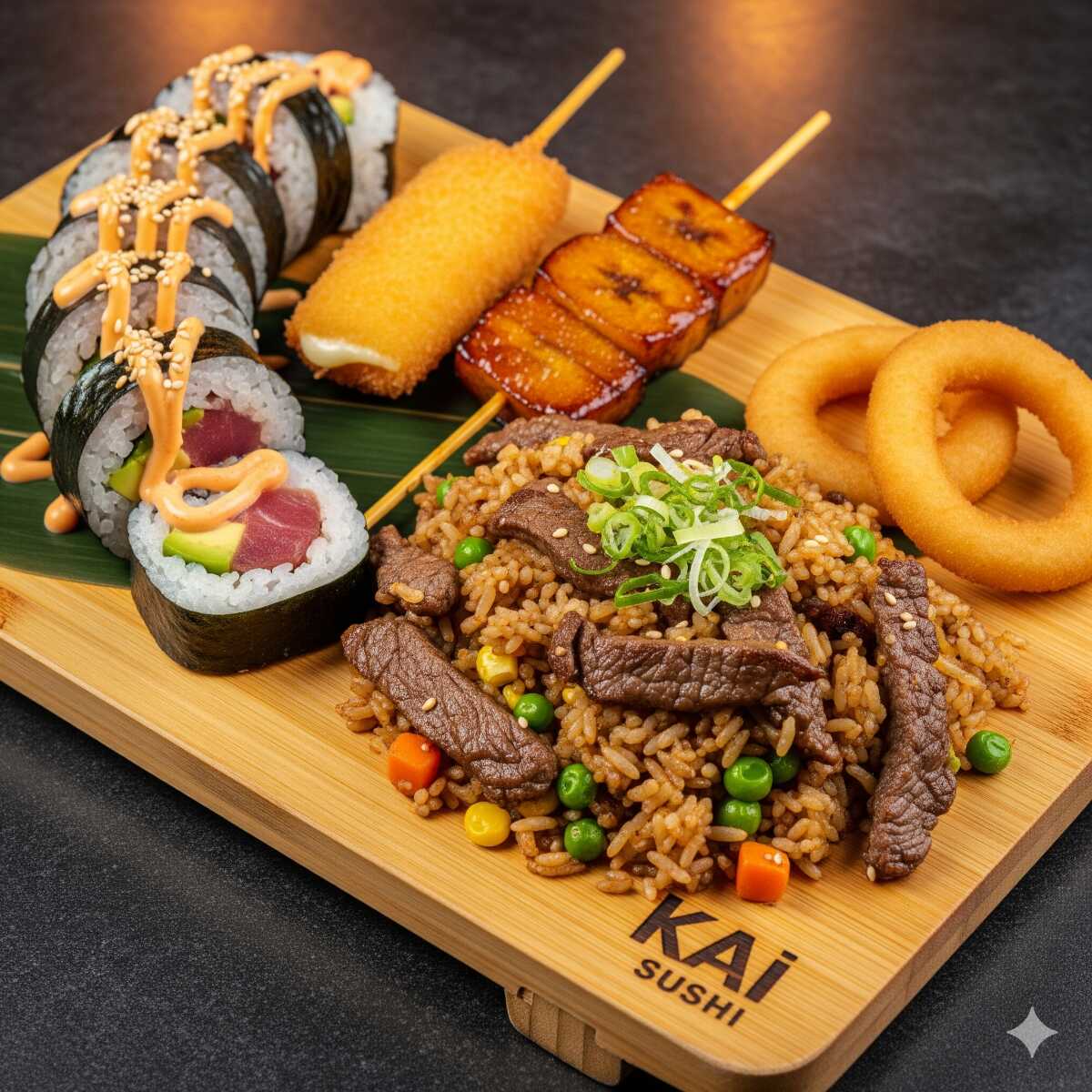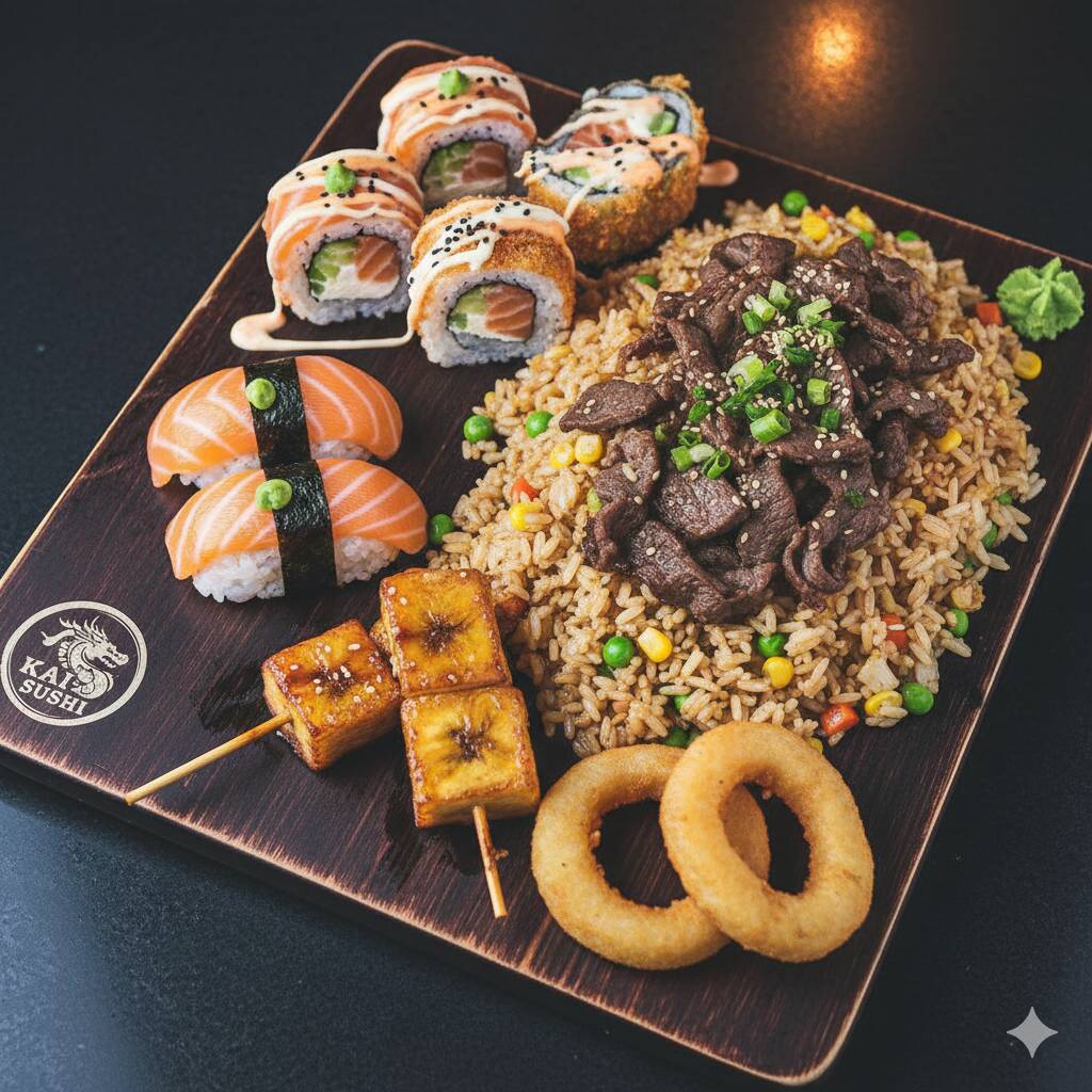 2 Rollo maki o empanizado 2 nigiris de salmón 2 kushiagues (queso/plátano) yakimeshi de arrachera o camarón 3 aros de cebolla