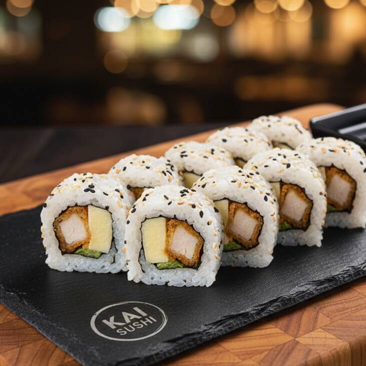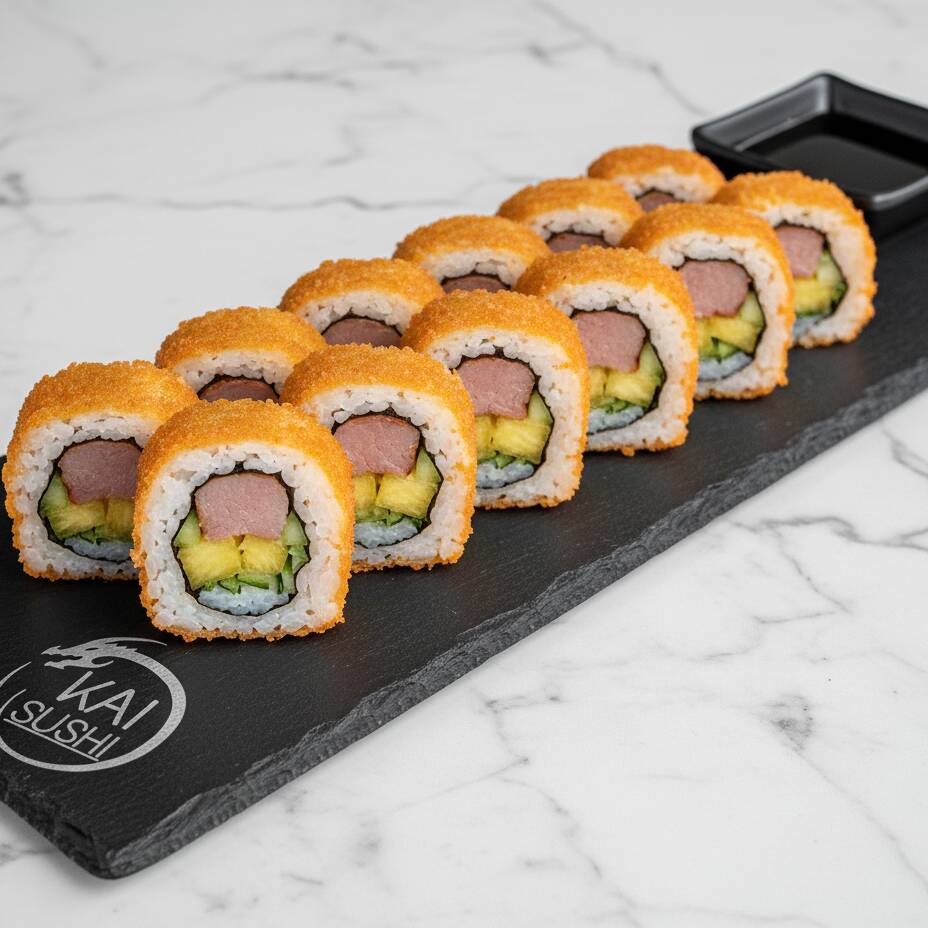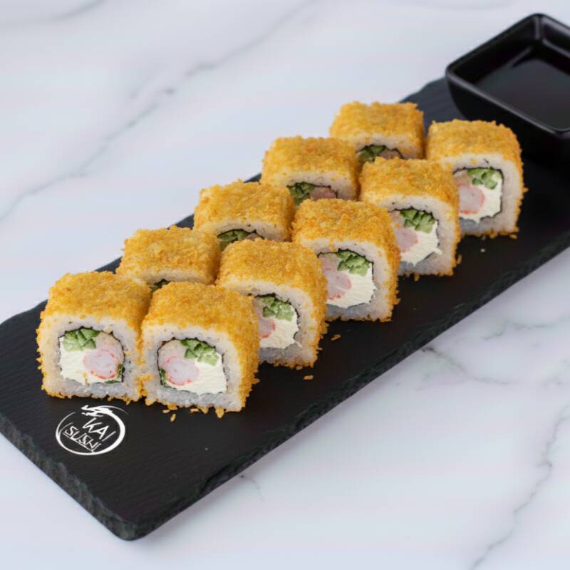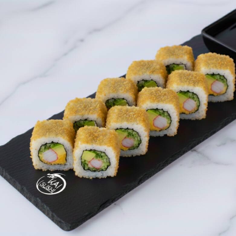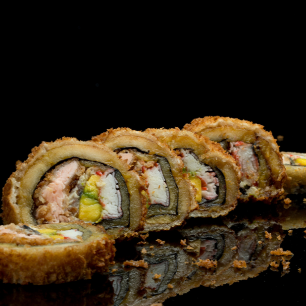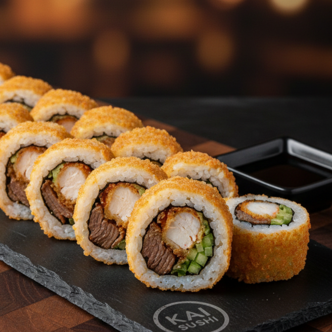 Rollo empanizado relleno de arrachera, camaron, pollo empanizado y pepino.