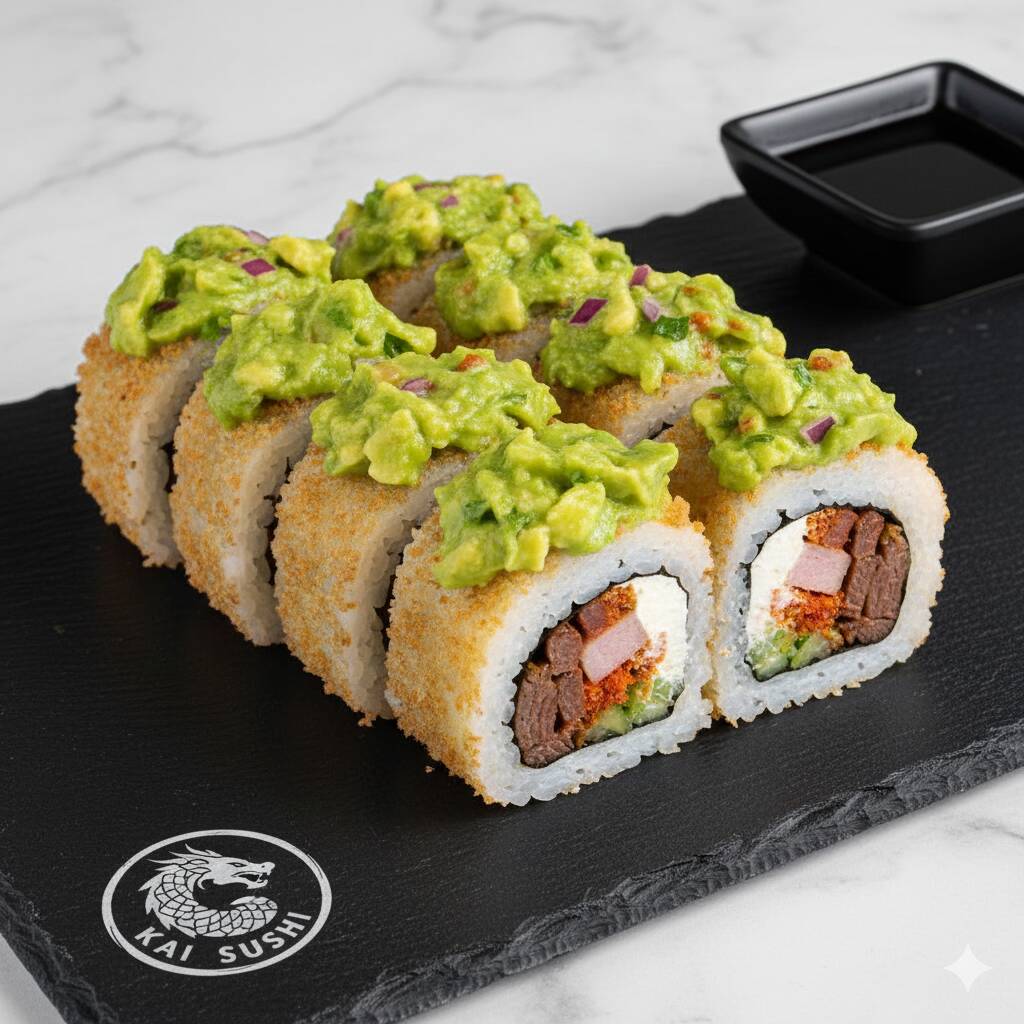 Rollo empanizado con arrachera, chuleta ahumada, chorizo y queso crema, con guacamole encima.