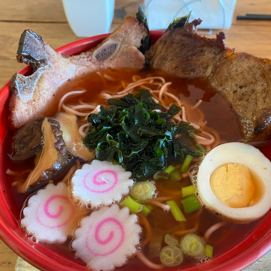Ramen picante con jugo de carne, chile de árbol, chuleta ahumada, huevo, alga nori, wakame, shitake, cebolllín, naruto y arrachera.