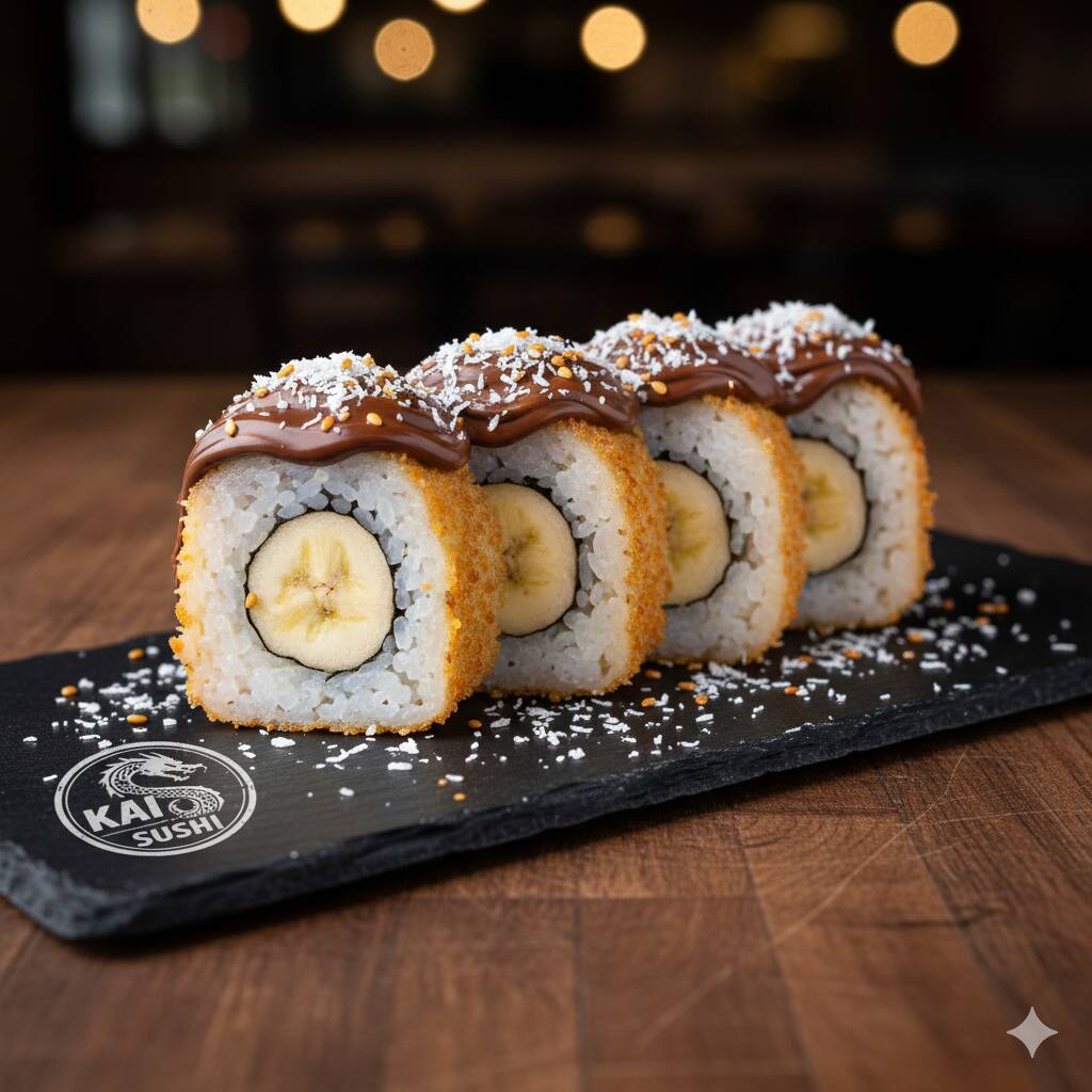 Rollo blanco relleno de plátano, empanizado con panko, capa de nutella, espolvoreado de coco rallado y ajonjolí dulce